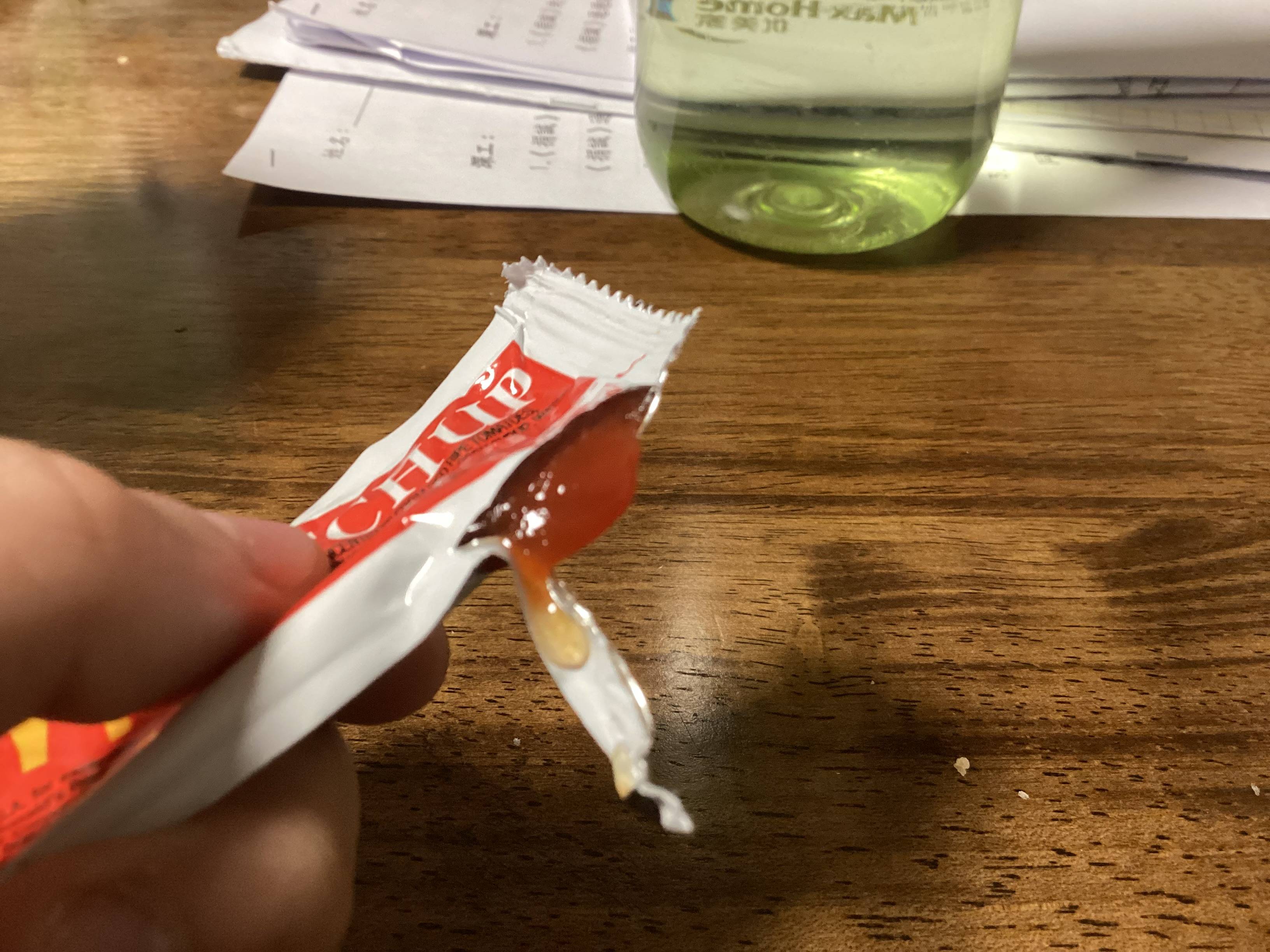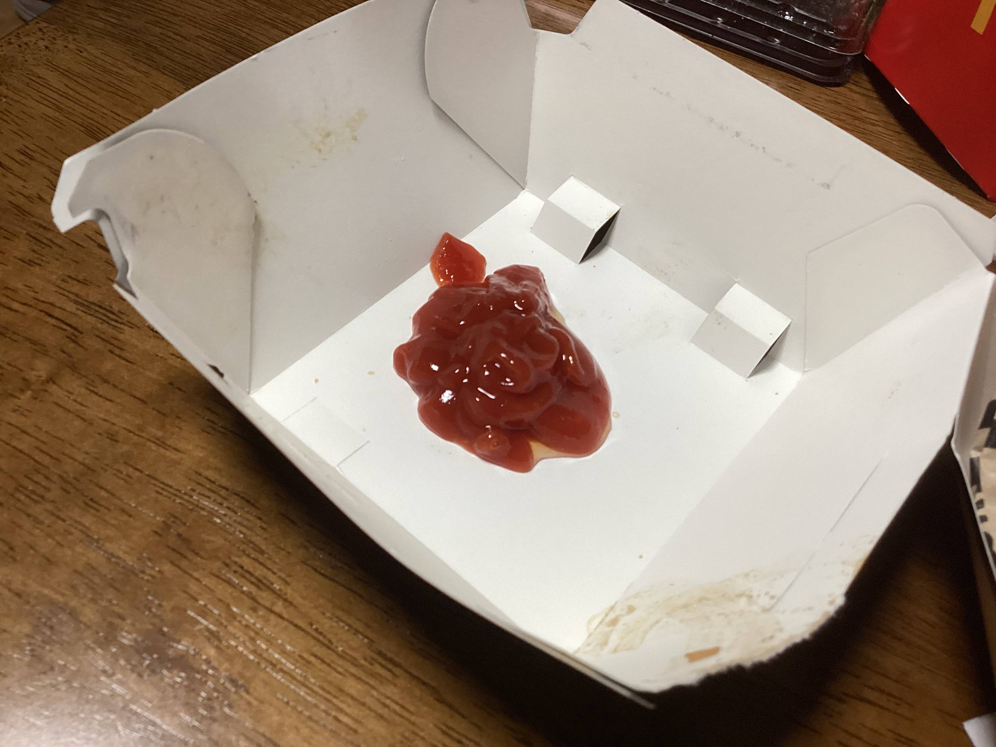 觀眾謙仔提供的相片可見,包裝茄汁在唧出茄汁時,已經出現不明液體,完全唧出來後,旁邊都有一攤液體,感覺有點嘔心。謙仔報料說,這是星期日下午在坑口的分店吃到的。