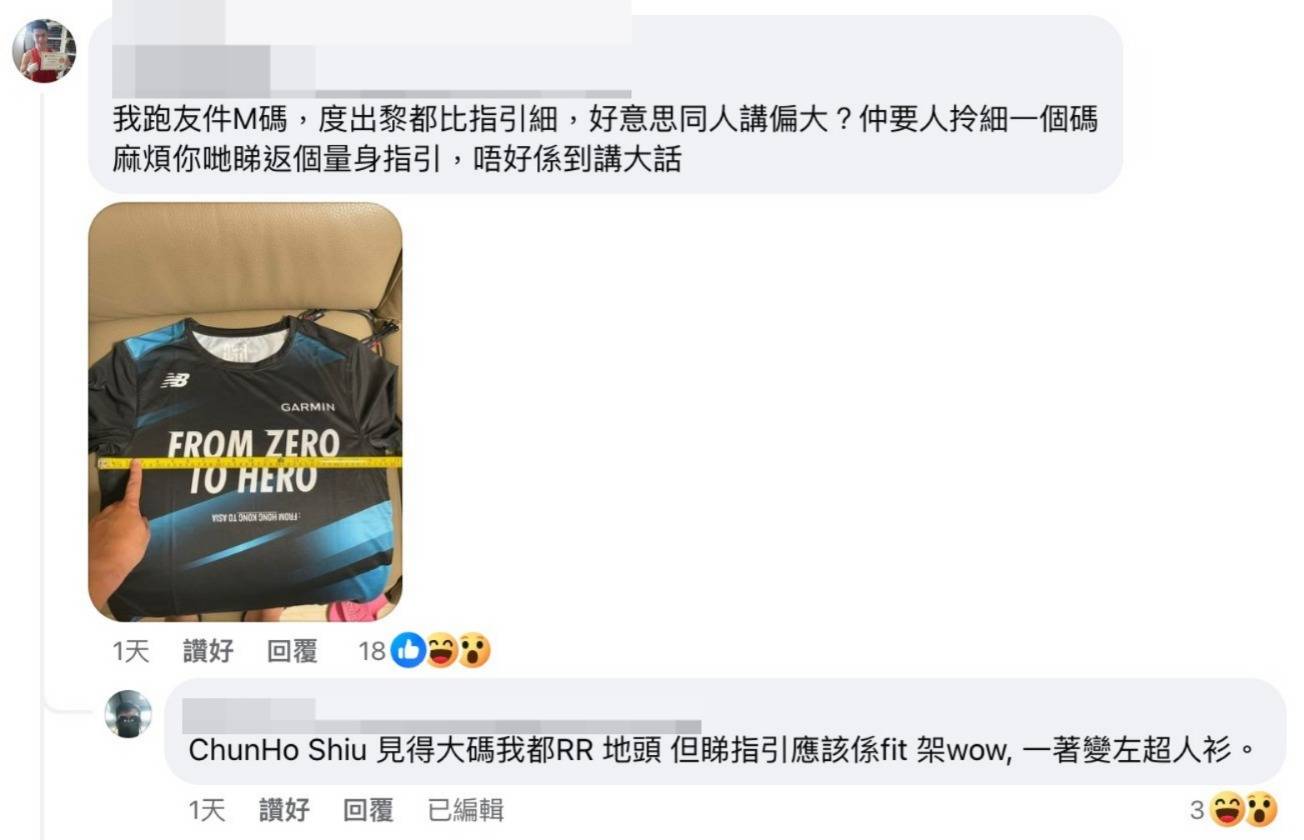 東張西望報料!有運動品牌亞洲系列賽跑手向東張西望報料,炮轟12月在香港舉行的賽事選手包安排非常混亂,很多跑手未能取得預訂的尺碼,最多是給的碼數變小,苦主炮轟:「件着唔落嘅衫點去跑步?」其男友更形容:「唔係個個人都可以着泳衣跑步囉!」也有網友笑說簡直變超人衫!