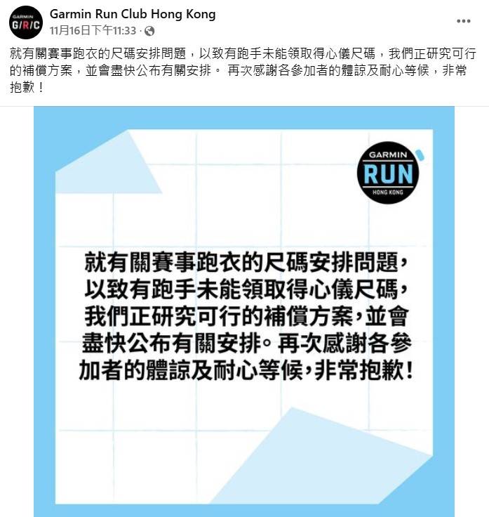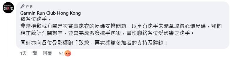 「東張+」正向賽事主辦方了解事件,對方稱稍後會回覆,而官方網頁目前發聲明解釋並致歉:「就有關賽事跑衣的尺碼安排問題,以致有跑手未能領取得心儀尺碼,我們正研究可行的補償方案,並會盡快公布有關安排。 再次感謝各參加者的體諒及耐心等候,非常抱歉!」