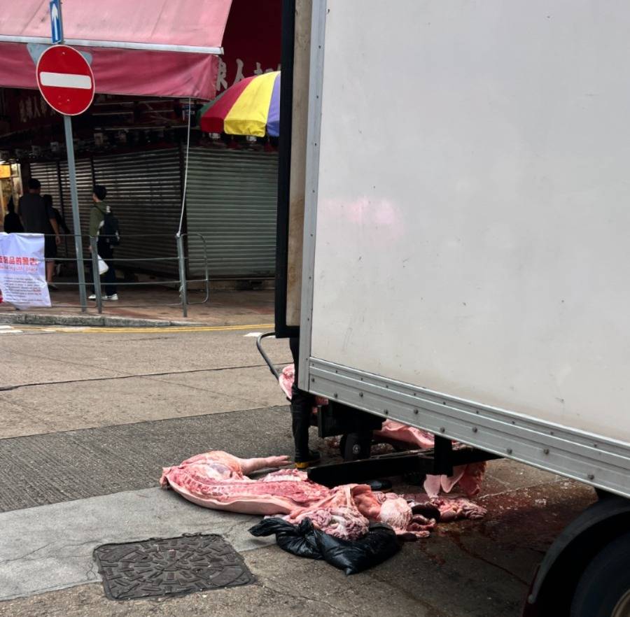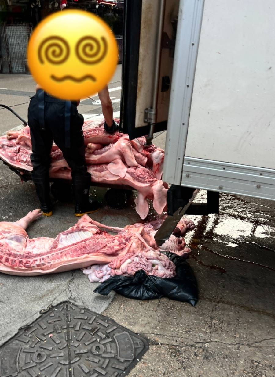 相片可見,衛生狀況的確非常惡劣!豬肉和內臟就是這樣攤在馬路上,一地血水,李先生說:「佢哋將豬肉直接放地面,而且成車肉都冇掛起,一大堆就咁放車廂內,工作人員拖豬肉落地時,更加直接踩上豬肉,來回幾次推貨雙鞋有幾髒可想而知!」
