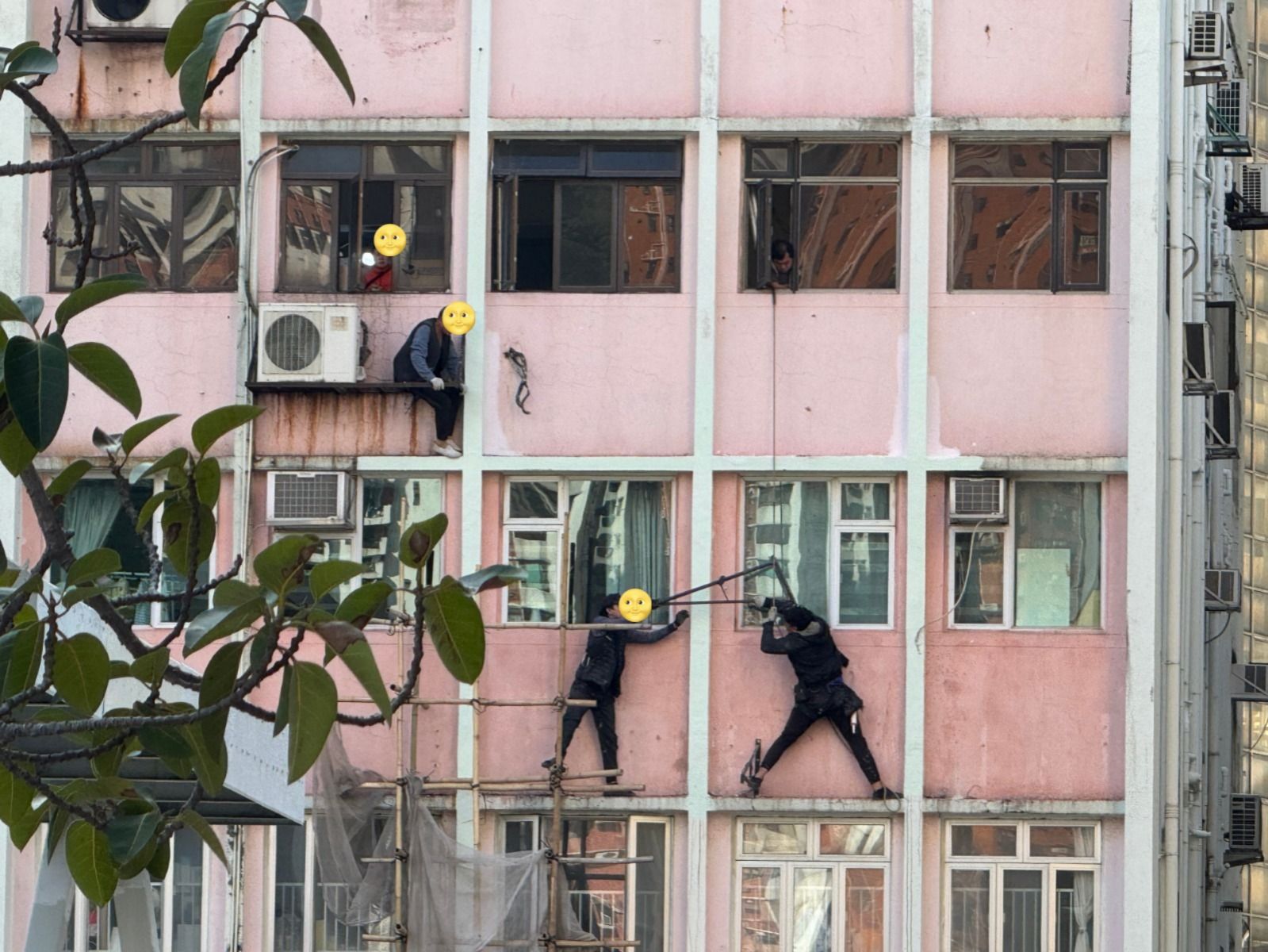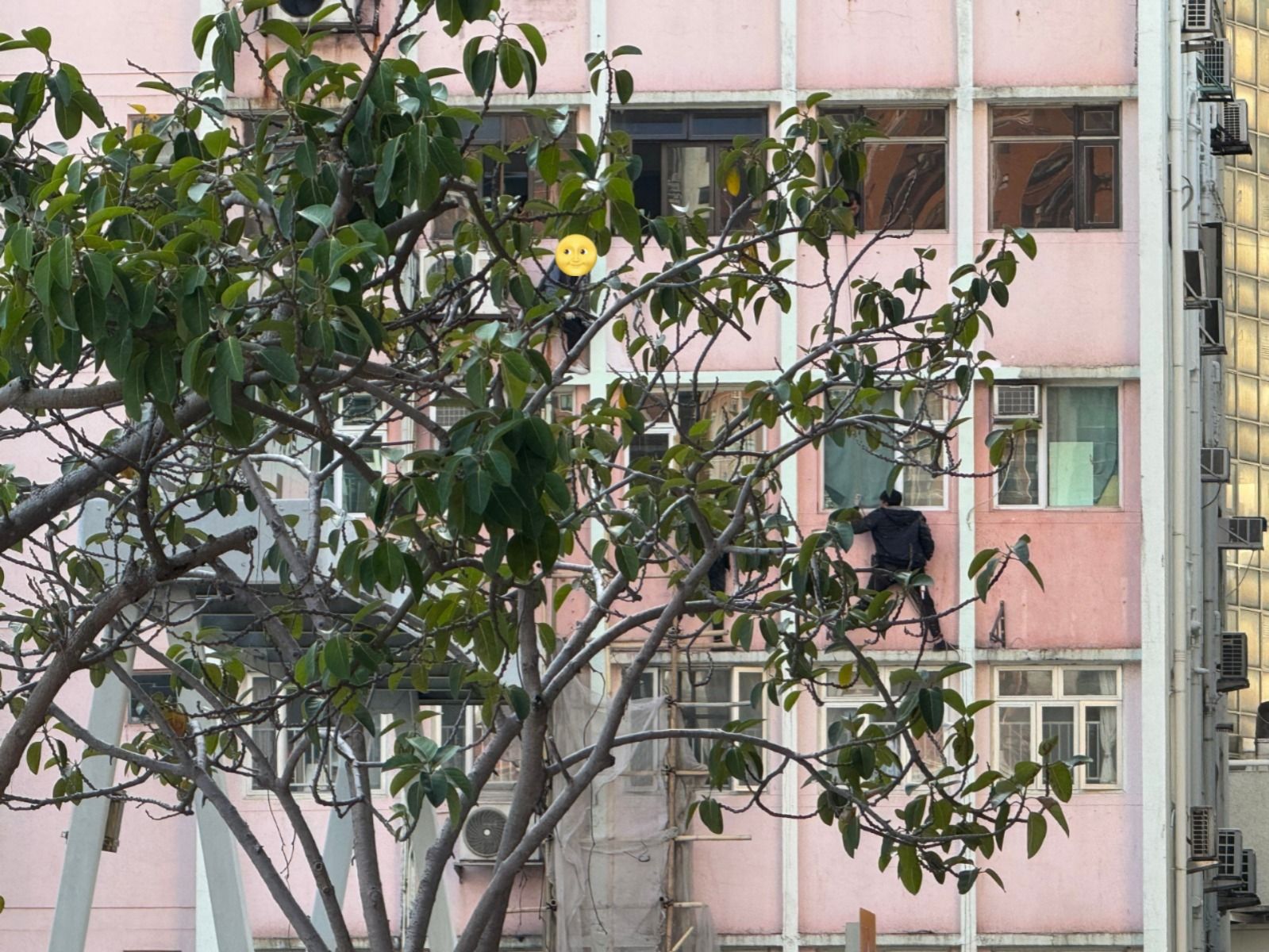 Judy提供的相片可見,幾名工人在外牆相信是搭建棚架,屋內有人查看情況,但其實一旦有什麼問題,估計難以保護外牆外的工人。