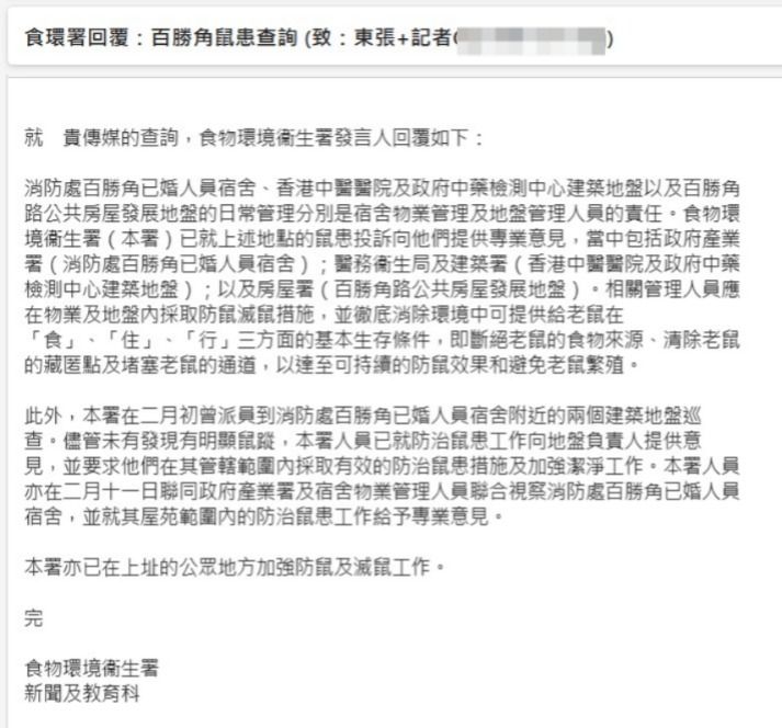 此外,食環署的信函指,在二月初曾派員到消防處百勝角已婚人員宿舍附近的兩個建築地盤巡查,要求地盤負責人在其管轄範圍內採取有效的防治鼠患措施及加強潔淨工作。