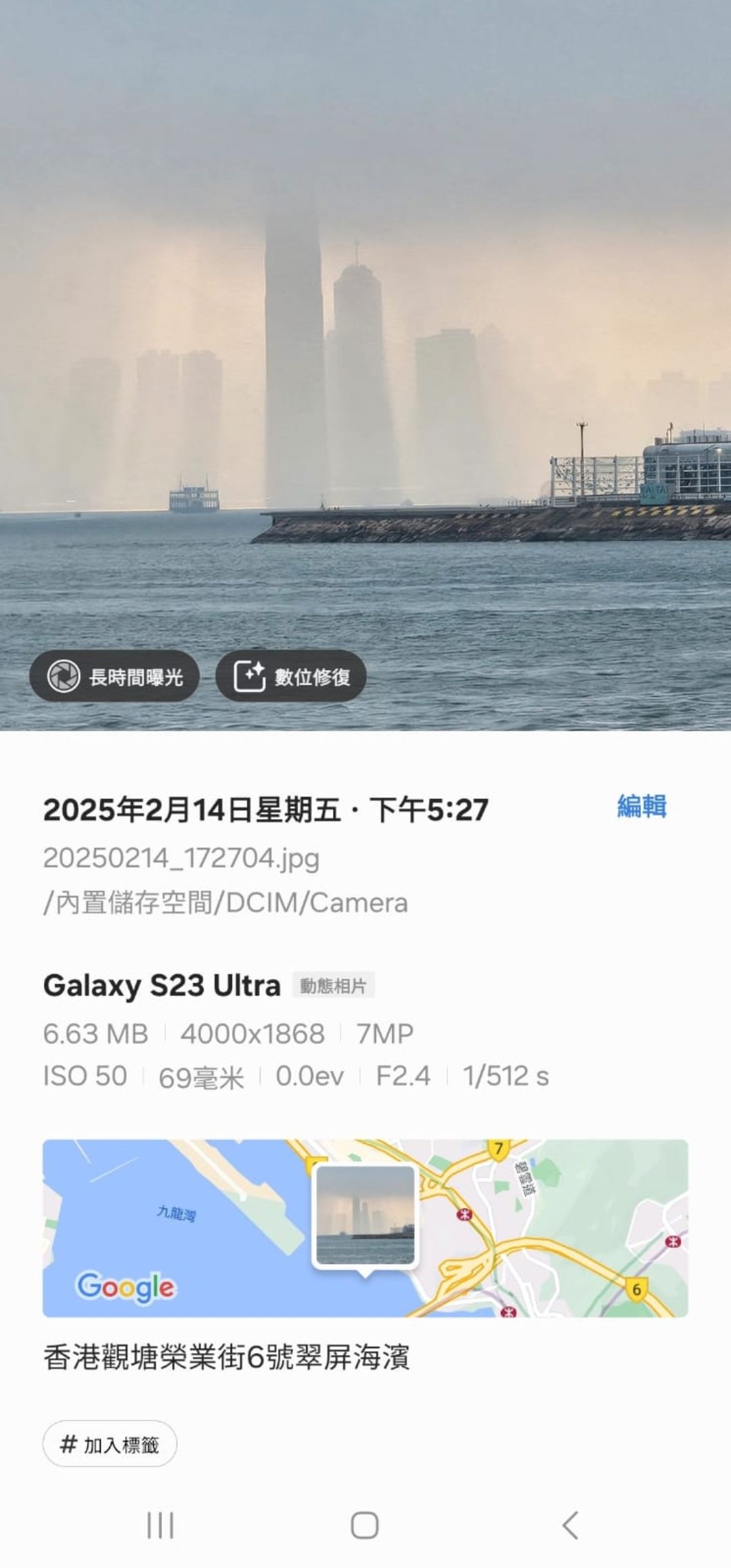 觀眾凌先生提供在2月14日黃昏5:27在觀塘海濱污水處理廠對開海面拍到的照片,可見對面海的樓宇出現海市蜃樓現象。