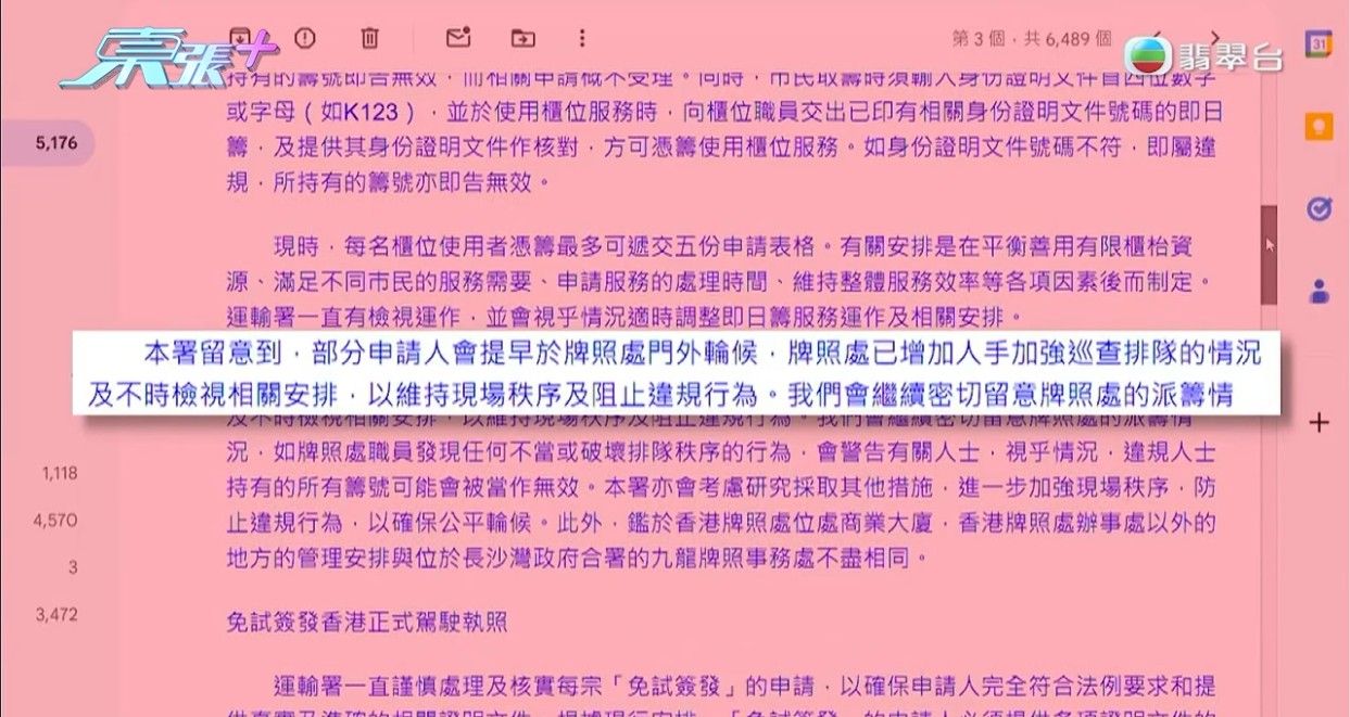本月中《東張西望》報道過小紅書排隊黨進駐運輸署牌照事務處代客填表(連結), 運輸署牌照事務處長期出現人龍,有市民指,有大量「排隊黨」長駐辦事處代辦手續影響市民,報道出街後,日前有觀眾開心報料,說情況已經有改善!