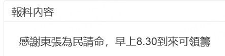 觀眾拍下運輸署籌號的相片開心報東張:「感謝東張為民請命,早上8:30到來可領籌。」