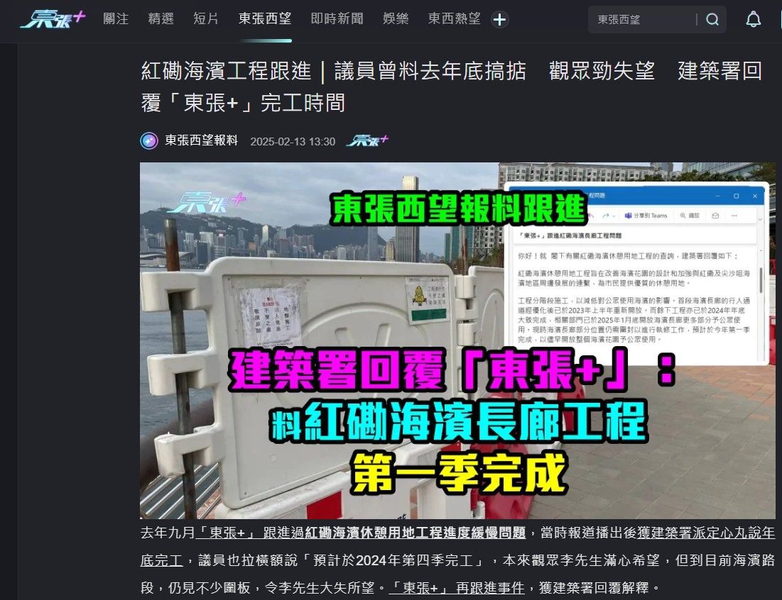 「東張+」 去年九月率先報道,紅磡海濱工程進度非常不理想,圍封超過兩年,李先生形容,不但影響市民晨運,也浪費了最佳欣賞煙花的位置,當時建築署回覆說去年年底可以完工,但截至今年年初仍未開放,錯過了觀看農曆年煙花的時間,「東張+」記者去信建築署查詢,當時建築署回覆表明將於第一季完成,結果在3月30日重新開放了!