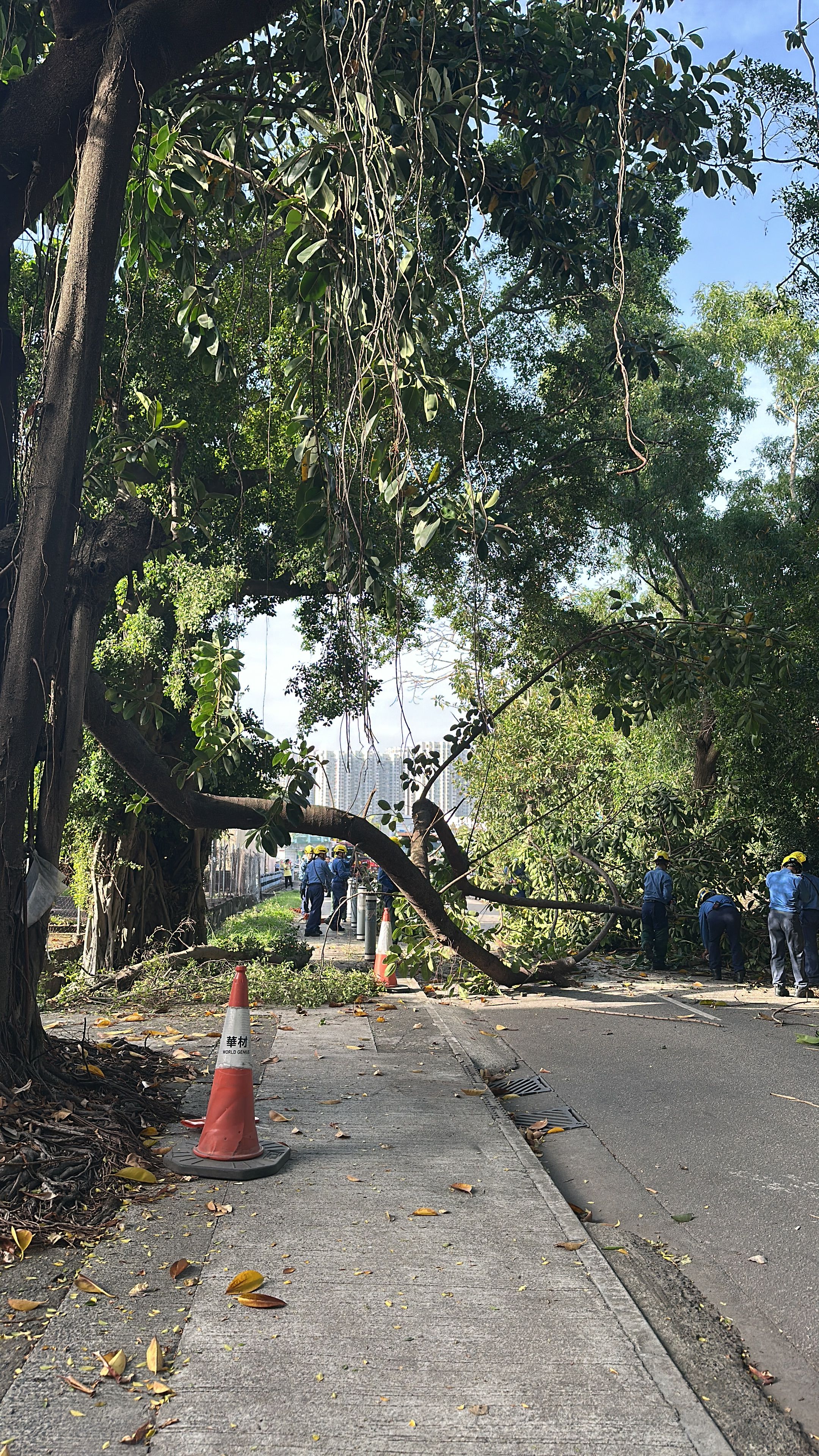 Krystal憶述說:「枯萎樹枝橫跨馬路及門口,砸中私家車及差點傷到途人。」