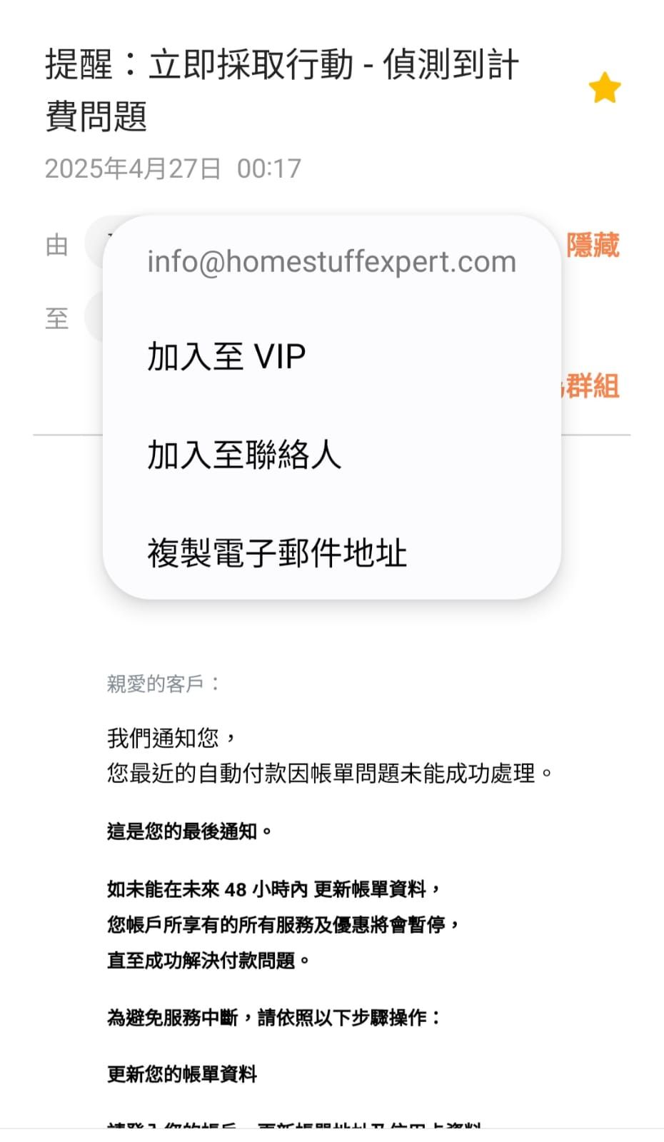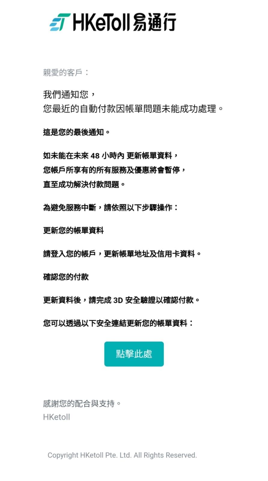 電郵也非常蠱惑,有警告字句,說:「這是您的最後通知。」「如未能在未來48小時內更新賬單資料,您帳戶所享有的所有服務及優惠將會暫停,直至成功解決付款問題。」