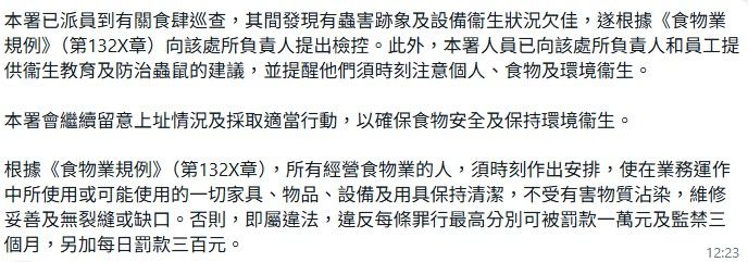 食環署向「東張+」記者透露,「東張+」報道後,署方派員到有關食肆巡查,「其間發現有蟲害跡象及設備衞生狀況欠佳,遂根據《食物業規例》(第132X章)向該處所負責人提出檢控」。