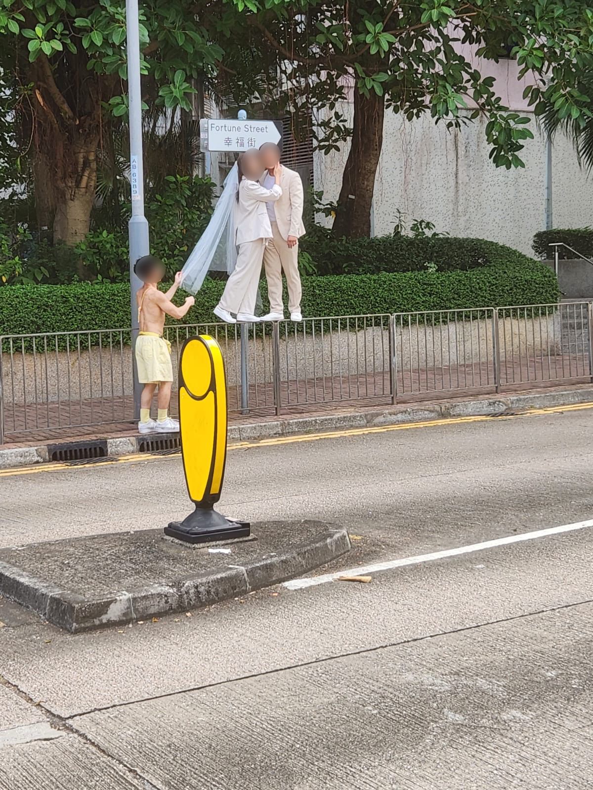照片拍攝於長沙灣幸福道,一對情人於馬路欄杆上拍攝婚紗相,看似十分幸福。