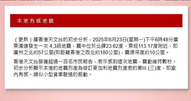 據香港天文台的初步分析,2025年6月23日(星期一)下午6時48分廣東清遠發生一次 4.3級地震,震中位於北緯23.62度,東經113.17度附近,即廣州之北約57公里(即距離香港之西北約180公里),震源深度約10公里。