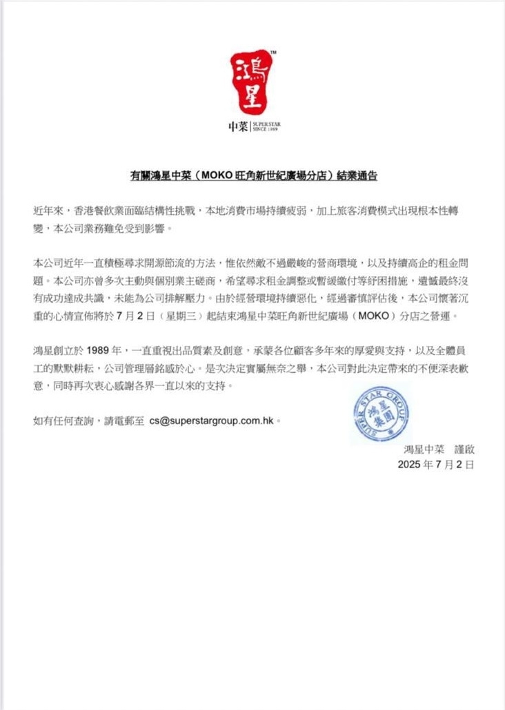 該通告中指,經審慎評估後,公司懷著沉重的心情宣布即日起結束鴻星中菜旺角新世紀廣場(MOKO)分店之營運,並強調今次決定實屬無奈之舉。