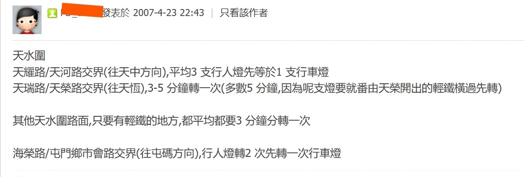 今年6月,Mandy透過1823電郵投訴交通燈等候時間過長,得到運輸署回覆指,交界是設計予輕鐵及車輛共用,所以運作週期會相對較長,但「我們已經調整燈號設定,以縮短天秀路西行的等候時間」