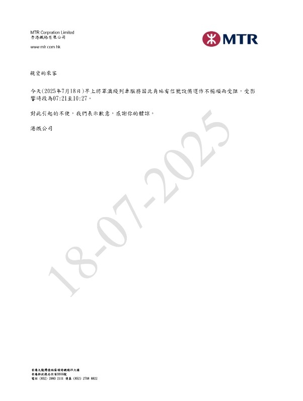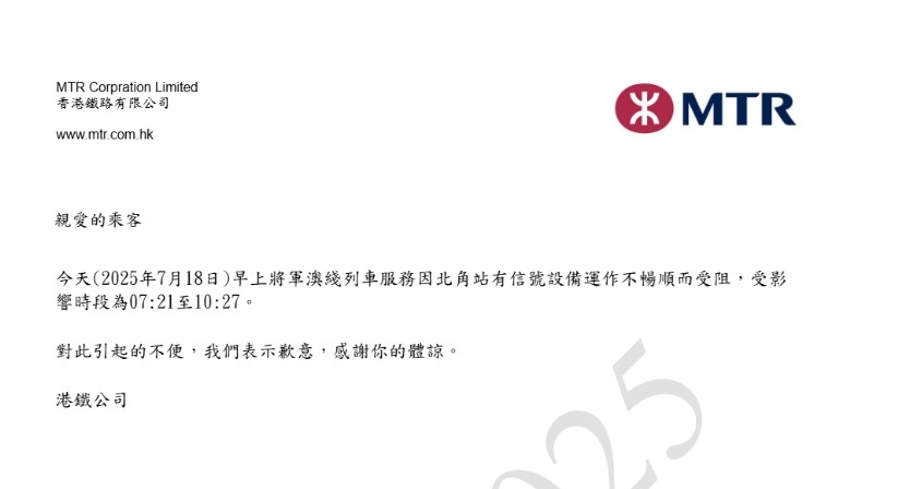 服務受阻持續約三小時後回復正常,港鐵亦在網站提供列車服務受阻通知書、供受影響的乘客下載。