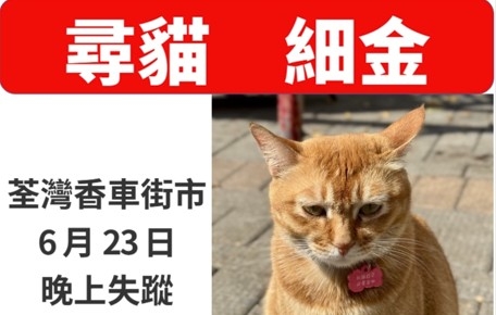 陳小姐說,細金失蹤後,很多網民自發尋貓,有網民目擊23日當日「有人停低同細金玩,之後用袋捉咗佢走,所以我都極度擔心細金既安危,佢已失蹤接近一個月」。