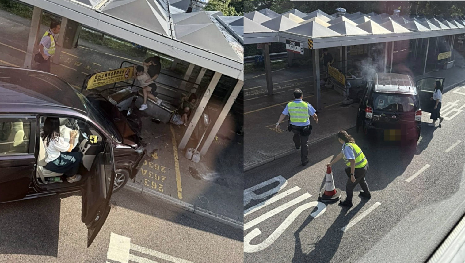 獨家片段曝光 | 城門隧道往荃灣方向今日(8月9日)發生交通意外。今天下午4時許,2輛私家車沿城門隧道往荃灣方向,駛至位於象鼻山路的城門隧道轉車站時相撞,其中一輛掛有「P牌」的私家車繼而撞向巴士站,車頭一度冒煙,安全氣袋彈出,站內欄杆及石凳損毀。