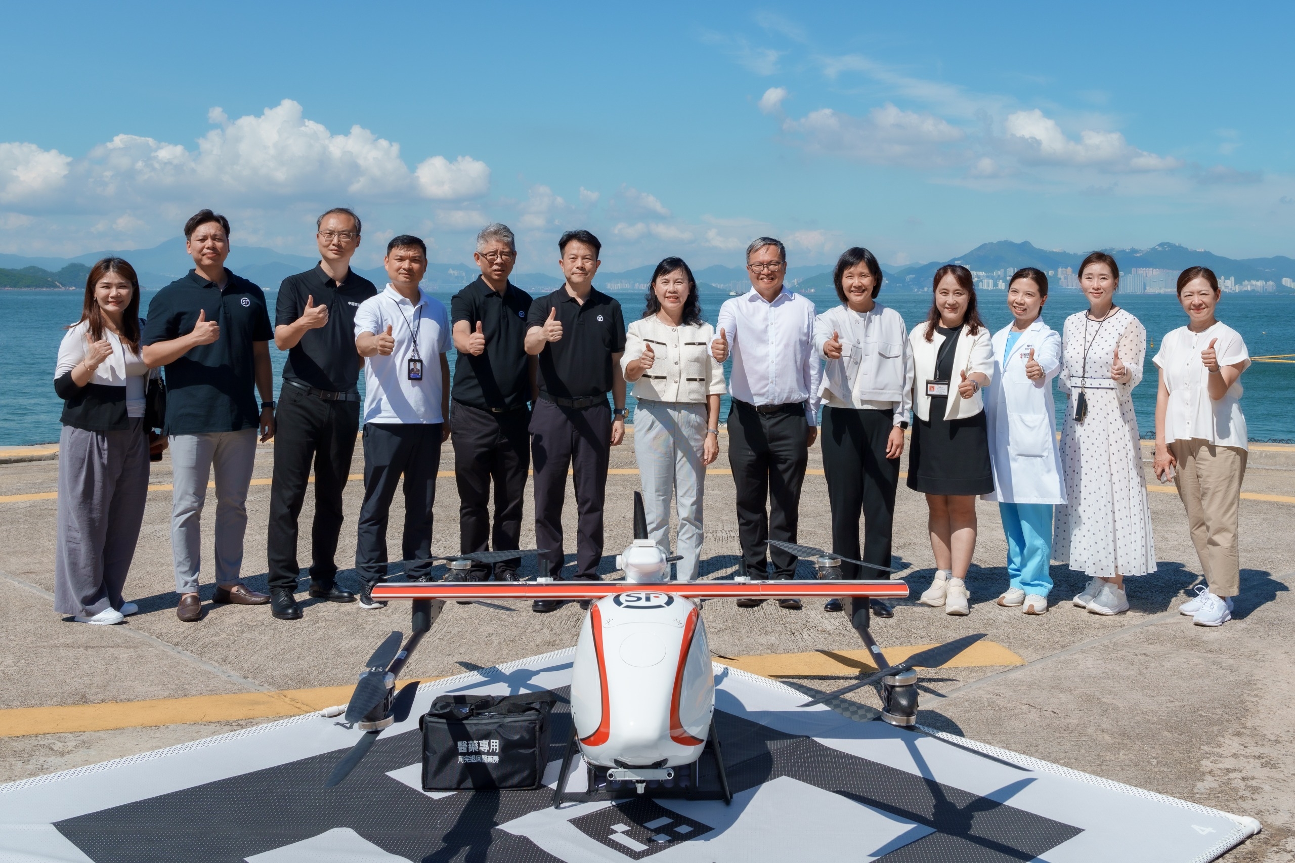 是次試飛,從數碼港的無人機起降場起飛,全程 12 公里跨海飛行。僅 18 分鐘,無人機便將藥物運送至位於長洲醫院附近的降落點,並由無人機機長將保溫箱中的藥物取出,交給長洲醫院醫生代表。這次試飛以醫療緊急配送為切入點,使用物流無人機派送貨物,時效提升達六成以上,以便捷創新的無人機技術,回應離島地區居民的醫療物流需求。