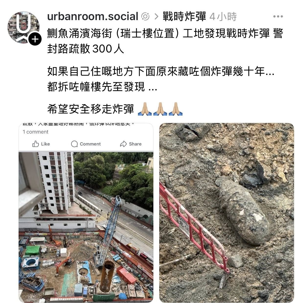 日前,鰂魚涌濱海街地盤,驚現二次大戰時的空投炸彈,經過警方和爆炸品處理課等人員,通宵撤離附近一帶住戶及拆彈,該枚炸彈終於順利燒毀。