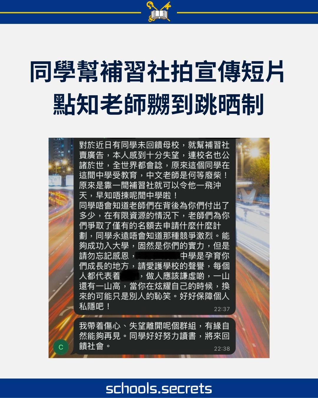 發帖者節錄了他們口中所說的中文科老師,在網上群組對話內容,大意是老師對於同學「未回饋母校,就替補習社賣廣告,感到十分失望。」老師更自嘲:「中文老師是何等廢柴!原來是靠一間補習社就可以令他一飛沖天。」