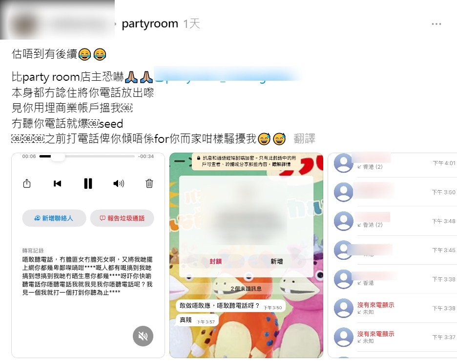 一宗原本屬於消費糾紛的事件,近日因店方失控行為而急速升級,引發網民廣泛關注。報料人持續提供最新消息,指自己與某Party Room店主就「麻雀機設定」爭執後,竟遭對方電話騷擾、惡言辱罵,甚至公開其樣貌及閉路電視片段,言語中更出現「見一個打一個」等恐嚇字眼,情況令人震驚。