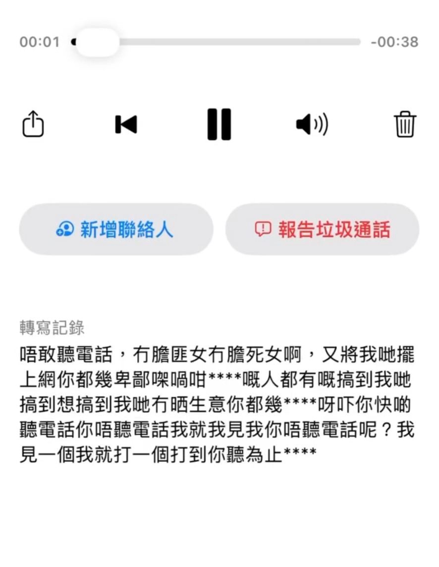 在事主公開的錄音中,店主語氣激動,內容包括:「你唔聽電話我就見一個我就打一個,打到你聽為止!」、「你都幾卑鄙㗎喎,咁賤嘅人都有!」。另一段錄音則聲稱已報警,並以「CID已經接手處理」作為威嚇手段,要求事主刪除網上內容。
