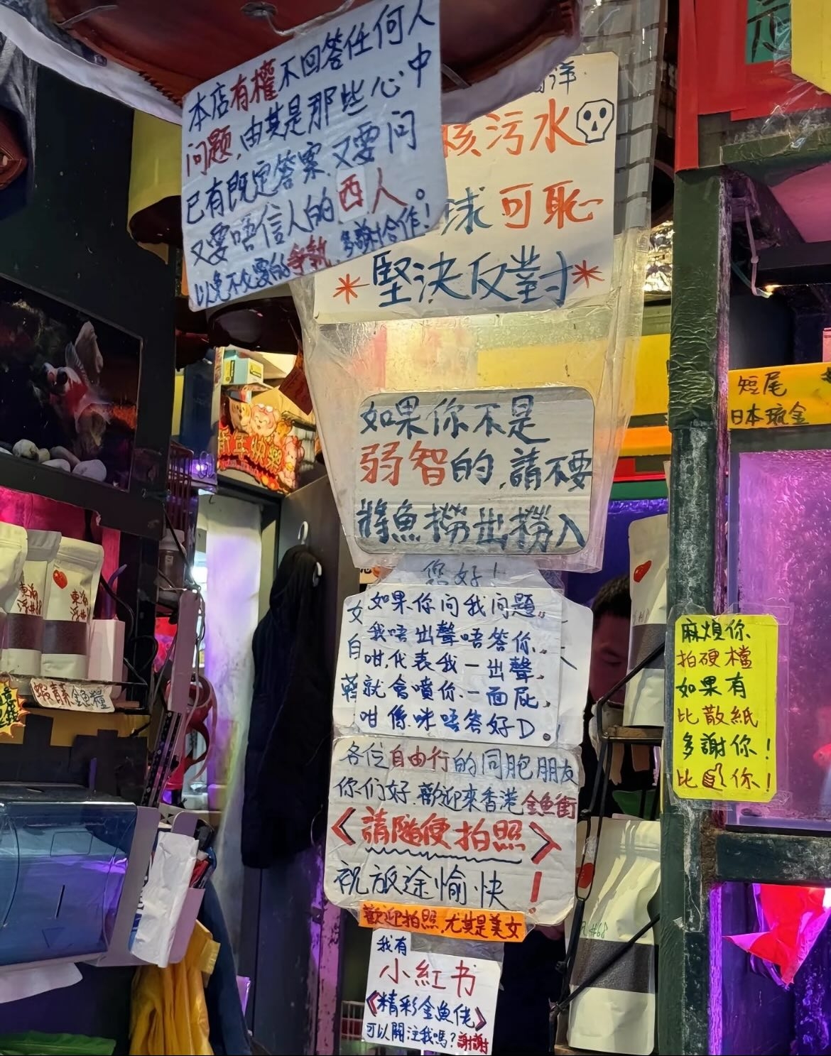 看看樓主上載的照片,只見到某間魚店,背景果然除了各式各樣的魚魚,最當眼的,還有形形式式的大字報和標語,節錄一部分看看,金魚檔口老闆說: