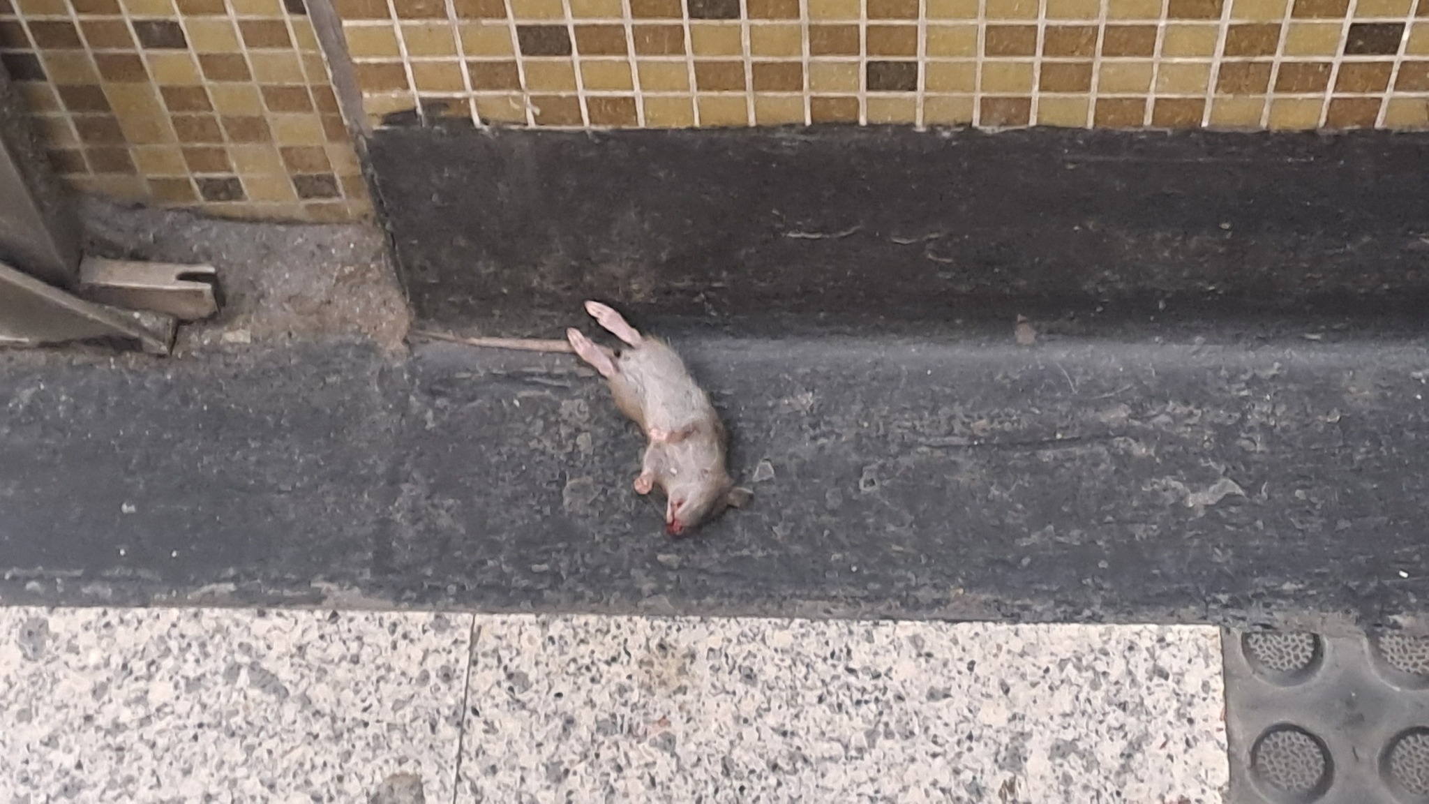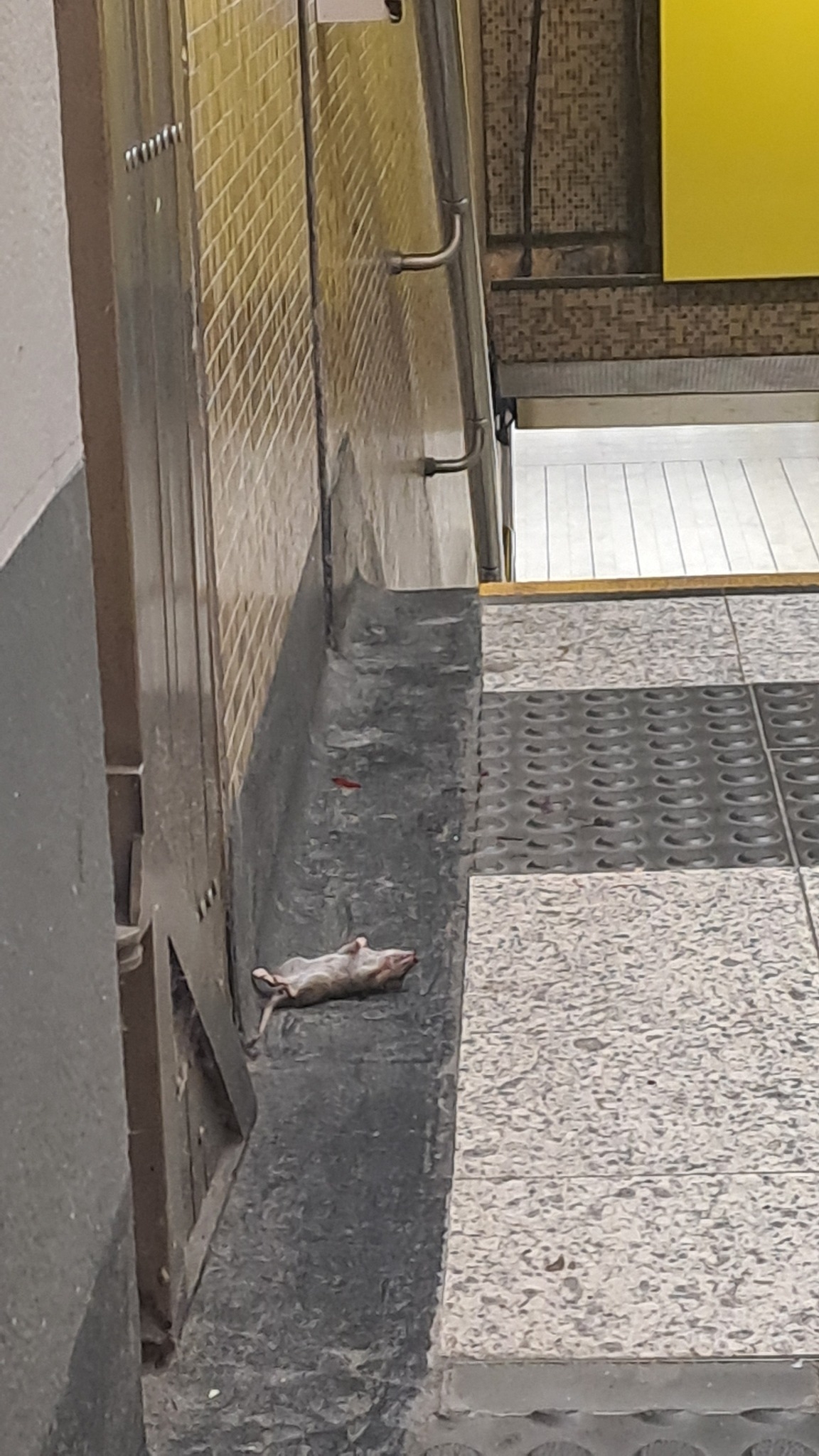 社交平台Threads看到一張少少核突、少少驚恐的照片,樓主疑似在港鐵站的出入口樓梯位,看到一隻肥美的「五星級巨鼠」,有無扮死,不知道;不過攤了在地上,GG了。
