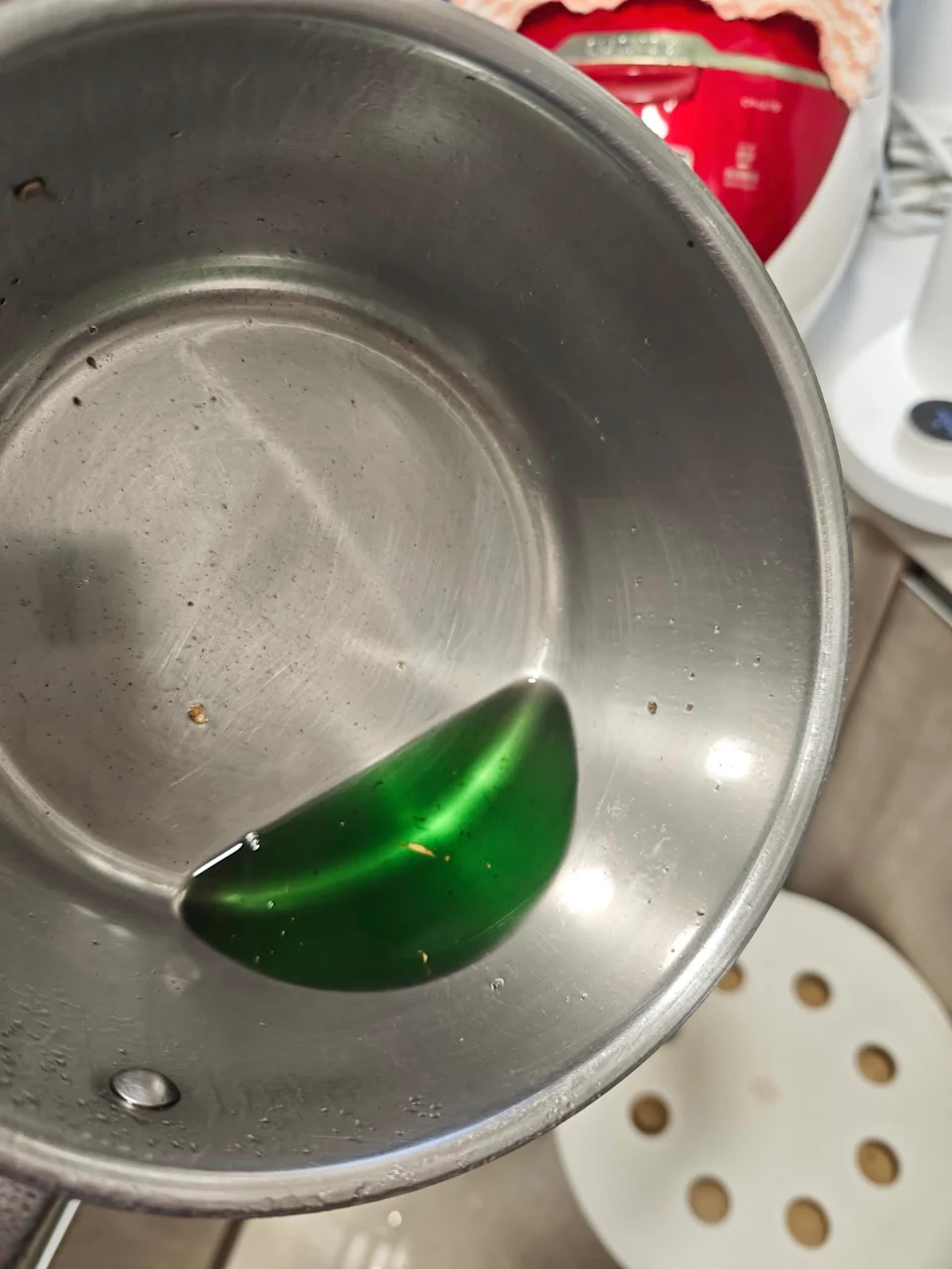 據樓主展示的照片所見,其炸出的薑蔥油竟是整碗「鮮綠色」,果然大癲!樓主再檢查餘下的青蔥,發現同時染上了紫藍色的顏料。