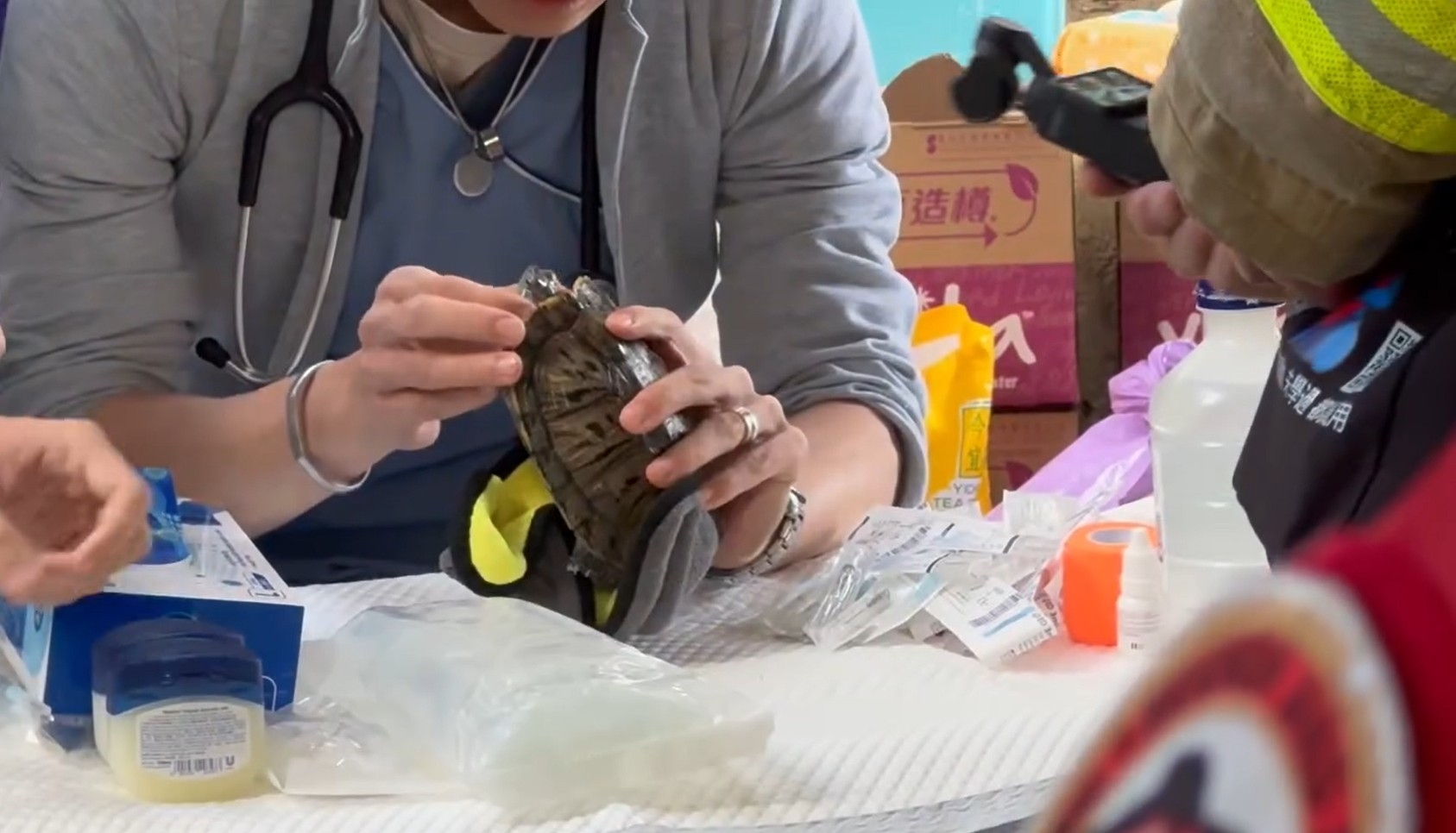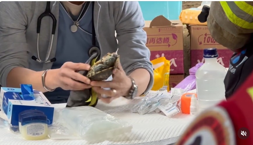 社交平台Threads「大埔宏福苑火災」群組近日流傳一條影片,片中拍攝到一位獸醫,細心為疑似受傷的龜龜細心檢查,醫生左右翻看龜龜傷勢,正在進行治療。