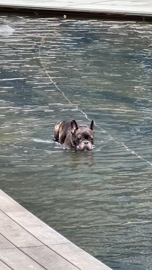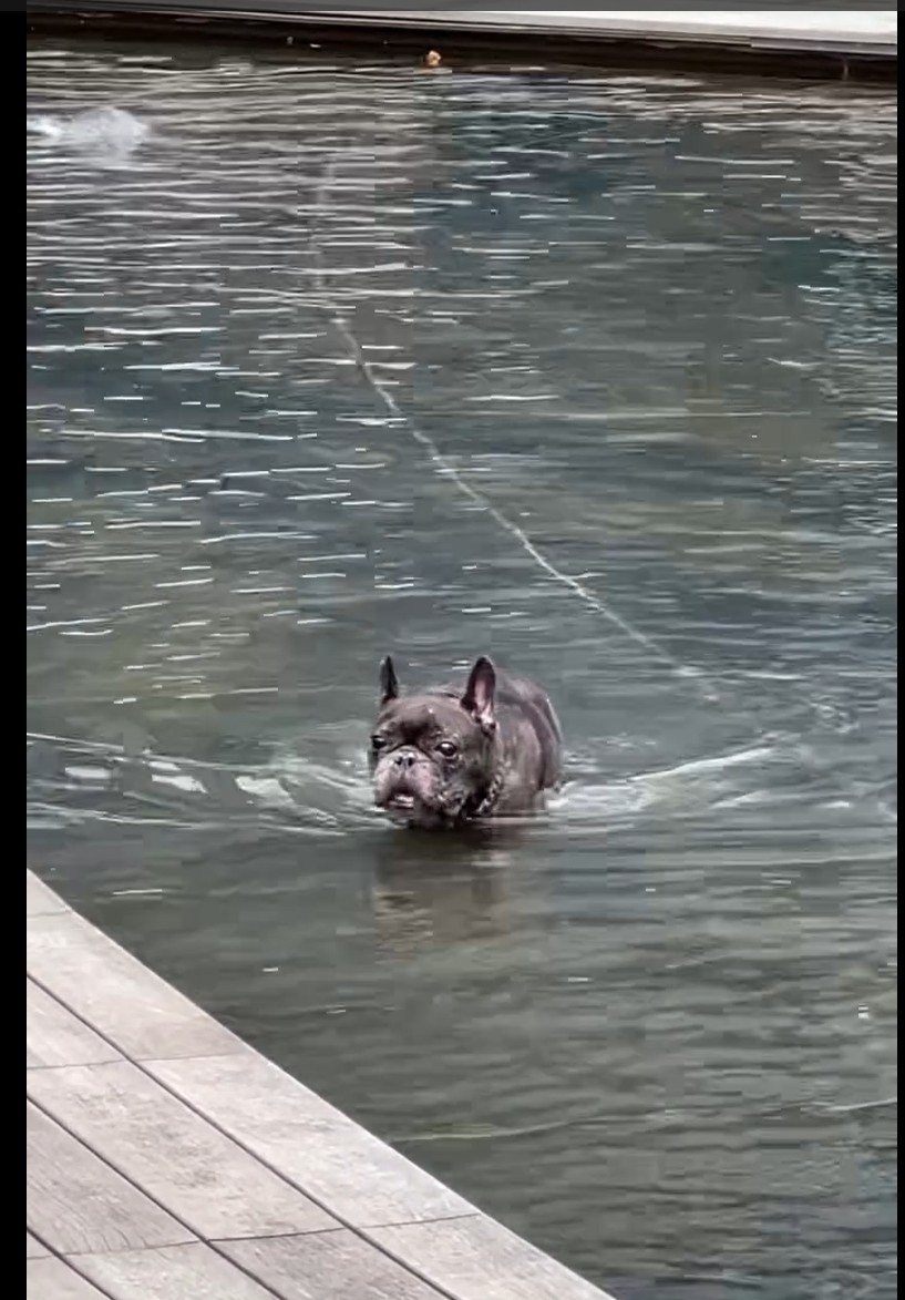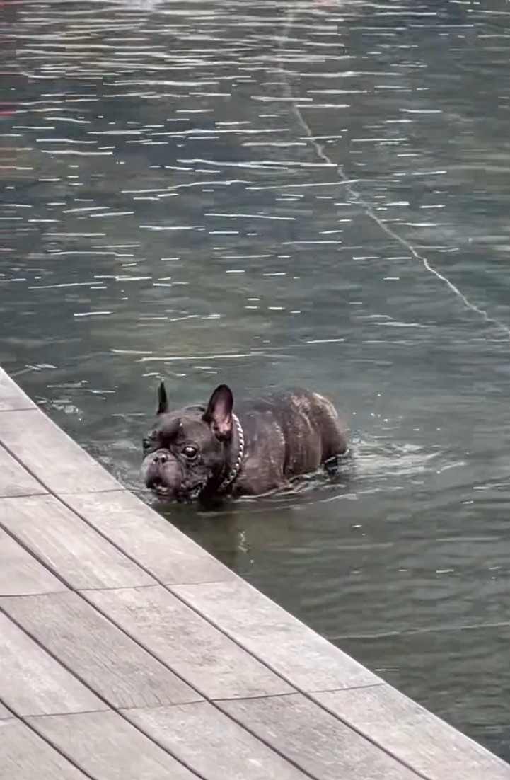 寵主開心配文:「大鄉里出城,見佢成日喺屋企附近行,趁佢生日諗住帶佢見識吓其他地方,去到 Airside出面草地,佢爆衝跳咗入水池,仲要成隻海豚咁跳吓跳吓,其實佢會唔會唔係狗仔😰。」