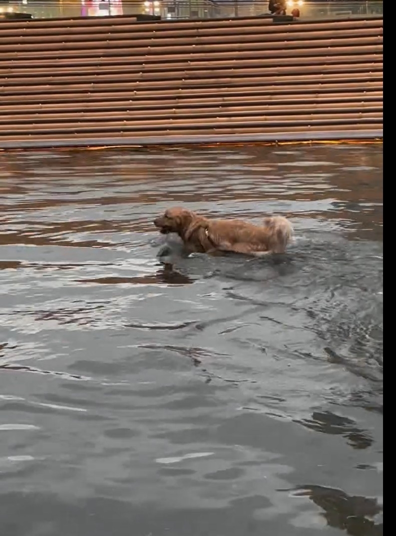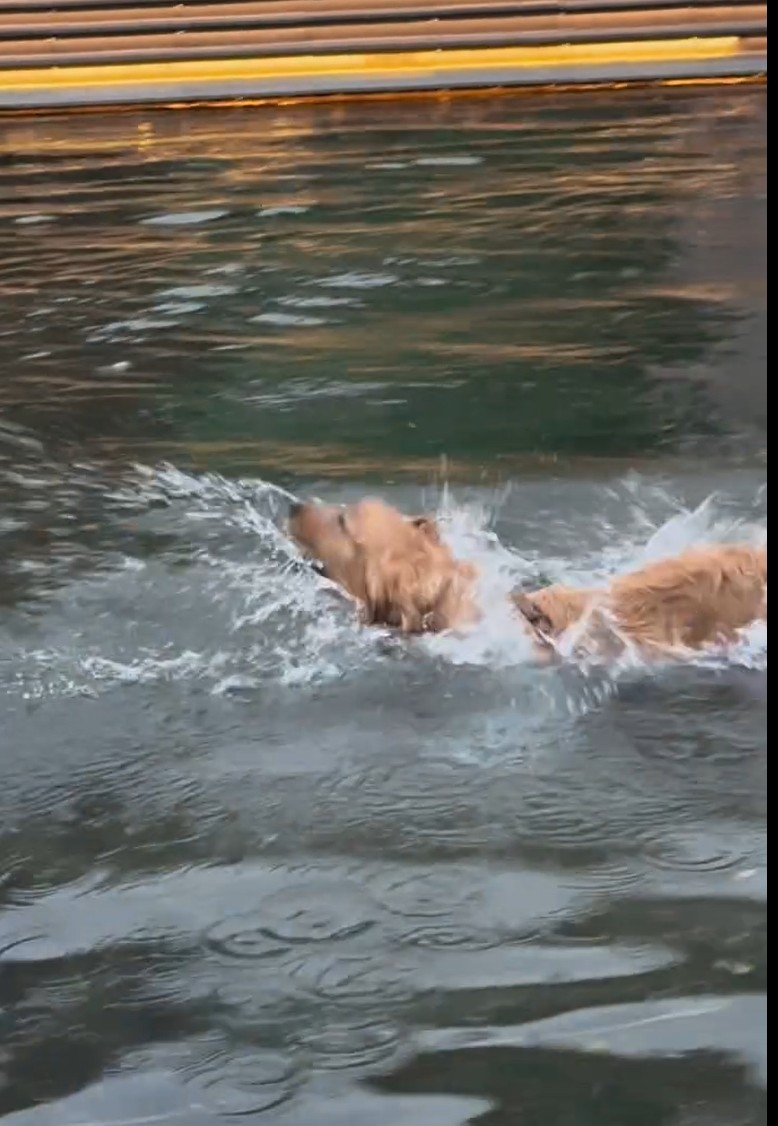 爆笑了!原來Airside商場水池有神秘魔力,看到片中的金毛尋回犬,來來回回水池之中放飛自我,游來游去,確實如寵主「成隻海豚跳吓跳吓!」。