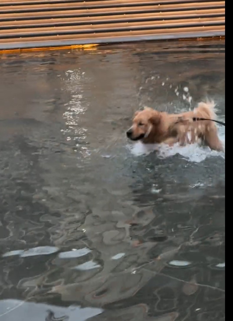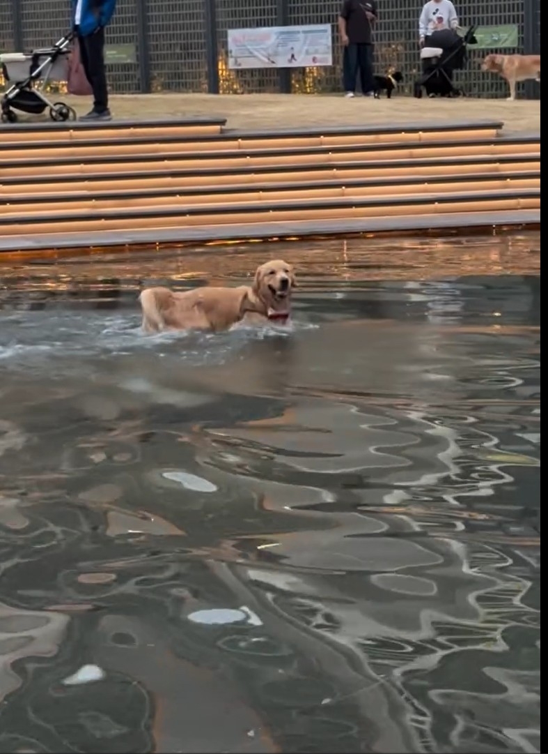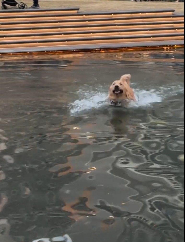 有脆友mongmongjai_1202在社交平台Threads,放上令人治癒心靈的影片。脆友的愛寵金毛尋回犬,在某大型商場外出的草地水池,玩得不亦樂乎。