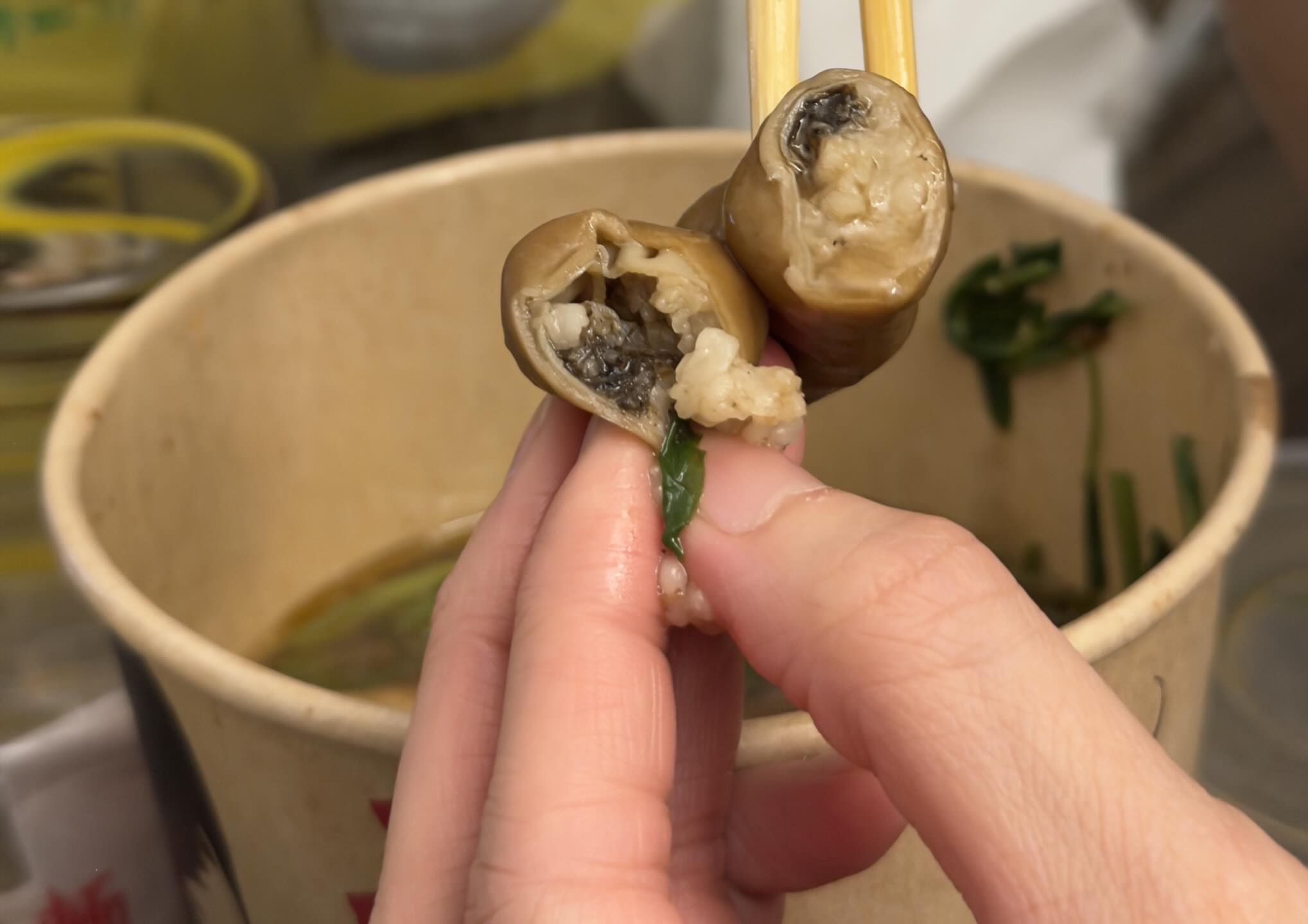 「去完旅行返嚟想食車仔麵,食到最後開始食啲豬腸覺得有啲怪,好似有沙咁,夾起嚟睇就知XX了,有屎💥之後剪開埋其他嗰啲,發現原來成段都有屎好似完全無洗過咁。」