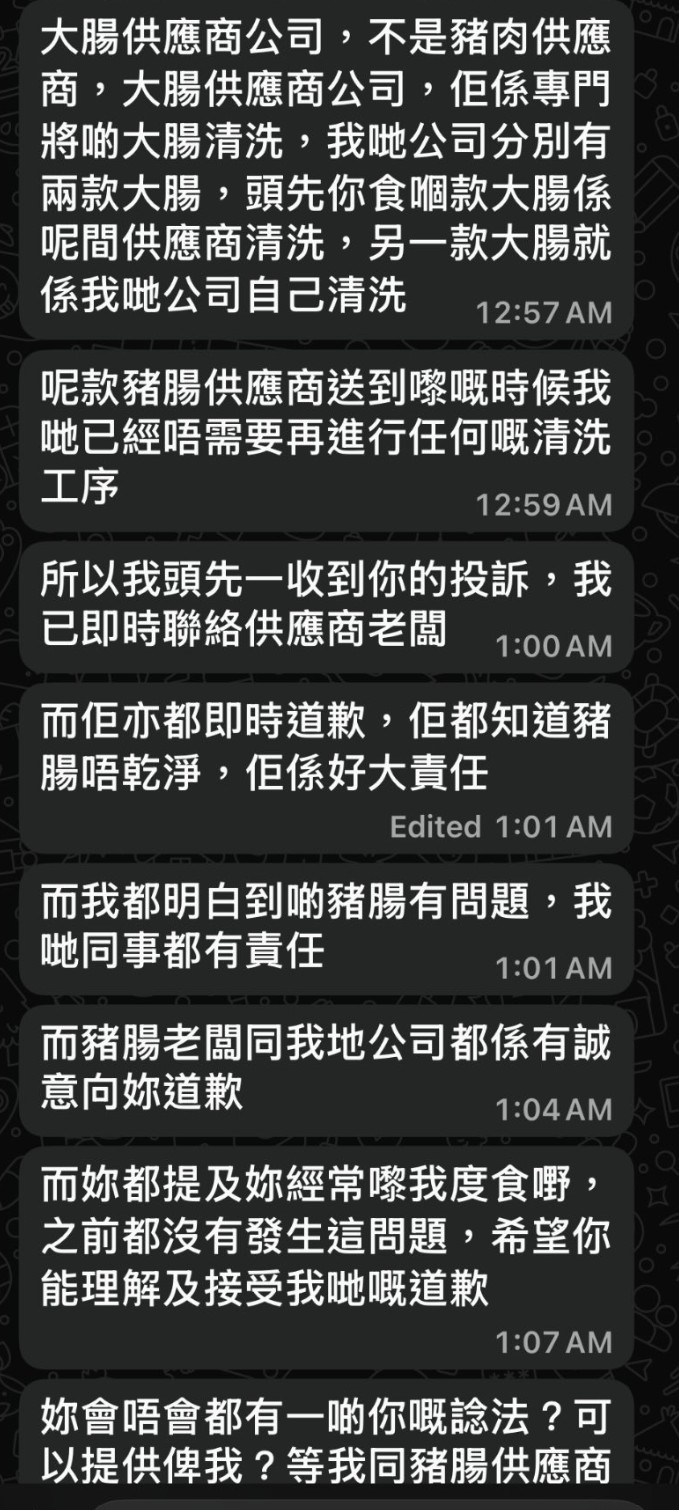 「我聯絡咗餐廳負責人,佢指出佢哋公司總共售賣兩種大腸,一種就係自己舖頭清洗再攞去整,一種係供應商提供,攞返嚟佢哋就會直接煮...唔理佢有幾多個供應商,我買嘅係餐廳出品,佢係有責任去監管好供應商,特別係食物嘅清潔情況。」