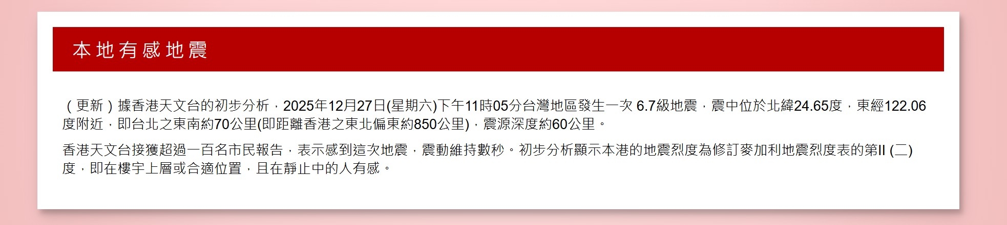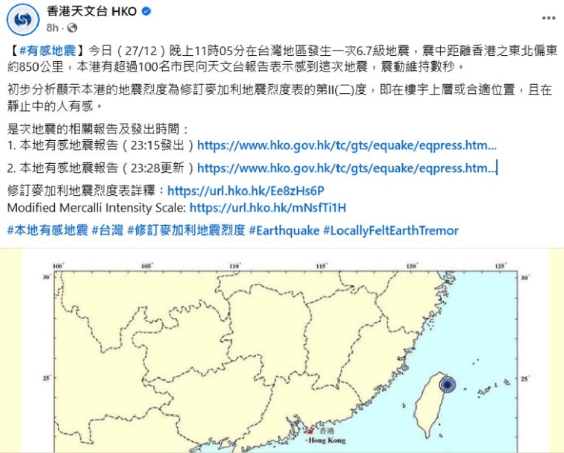 根據香港天文台Facebook官方專頁昨晚發布:今日(27/12)晚上11時05分在台灣地區發生一次6.7級地震,震中距離香港之東北偏東約850公里,本港有超過100名市民,向天文台報告表示感到這次地震,震動維持數秒。