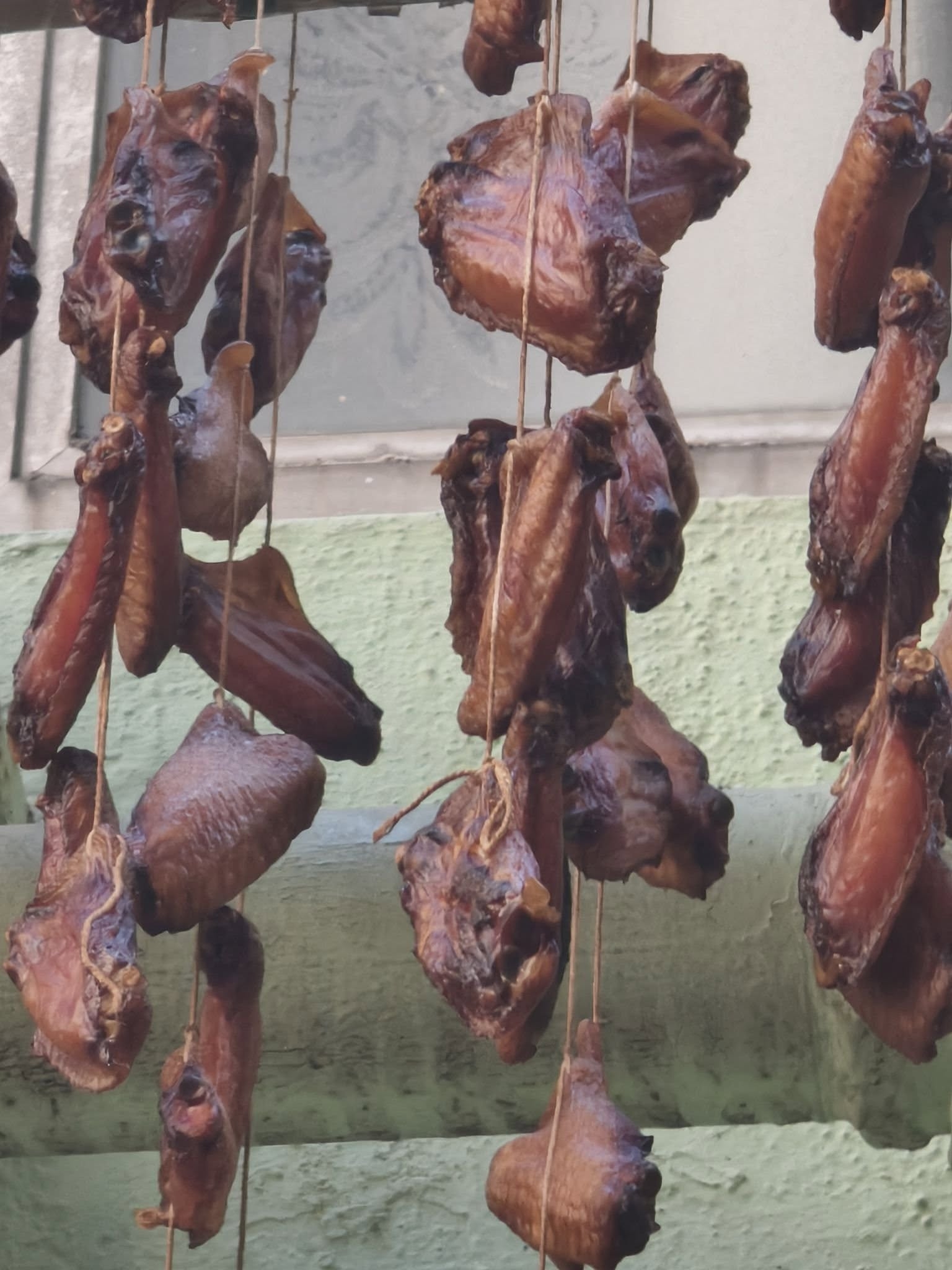 Facebook社交專頁「西環變幻時」看到新帖文,網民拍攝到某個住戶的窗邊有新發現,遠望,是一串串呈深啡色的食物,細看另一張較近鏡的照片,原來是好幾串,串起上來的雞中翼!其實晾曬雞翼的動機是什麼呢?真的會好味些麼?