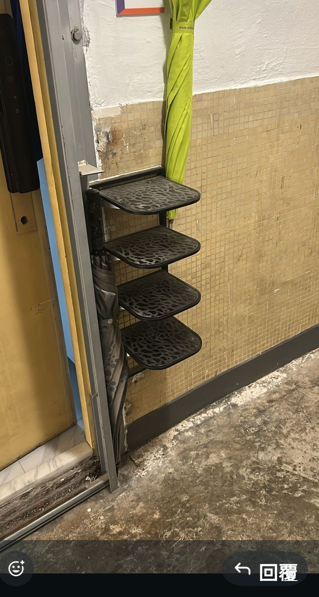 Well,樓主上載了一張應該是鞋架的照片,只剩下四格鞋架,空空如也,鞋架應該是自行安裝在鐵閘門旁。小鞋架旁,還有兩把長傘子。