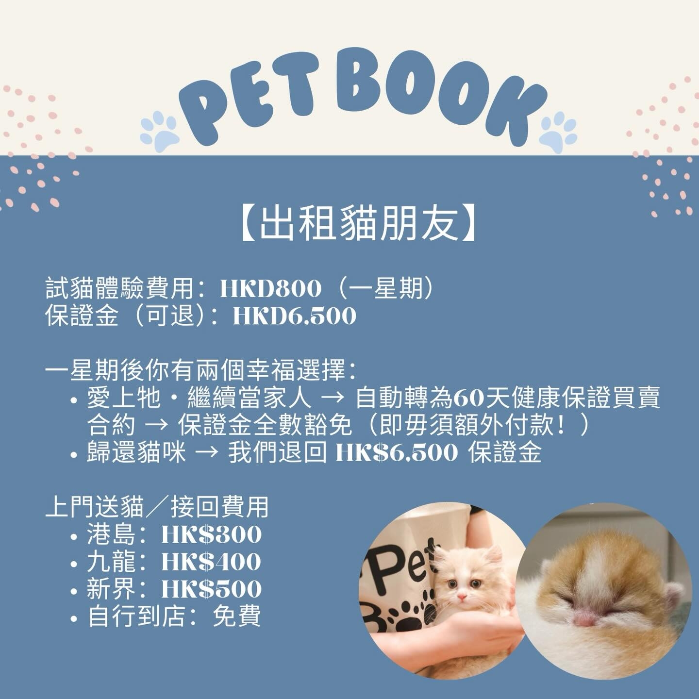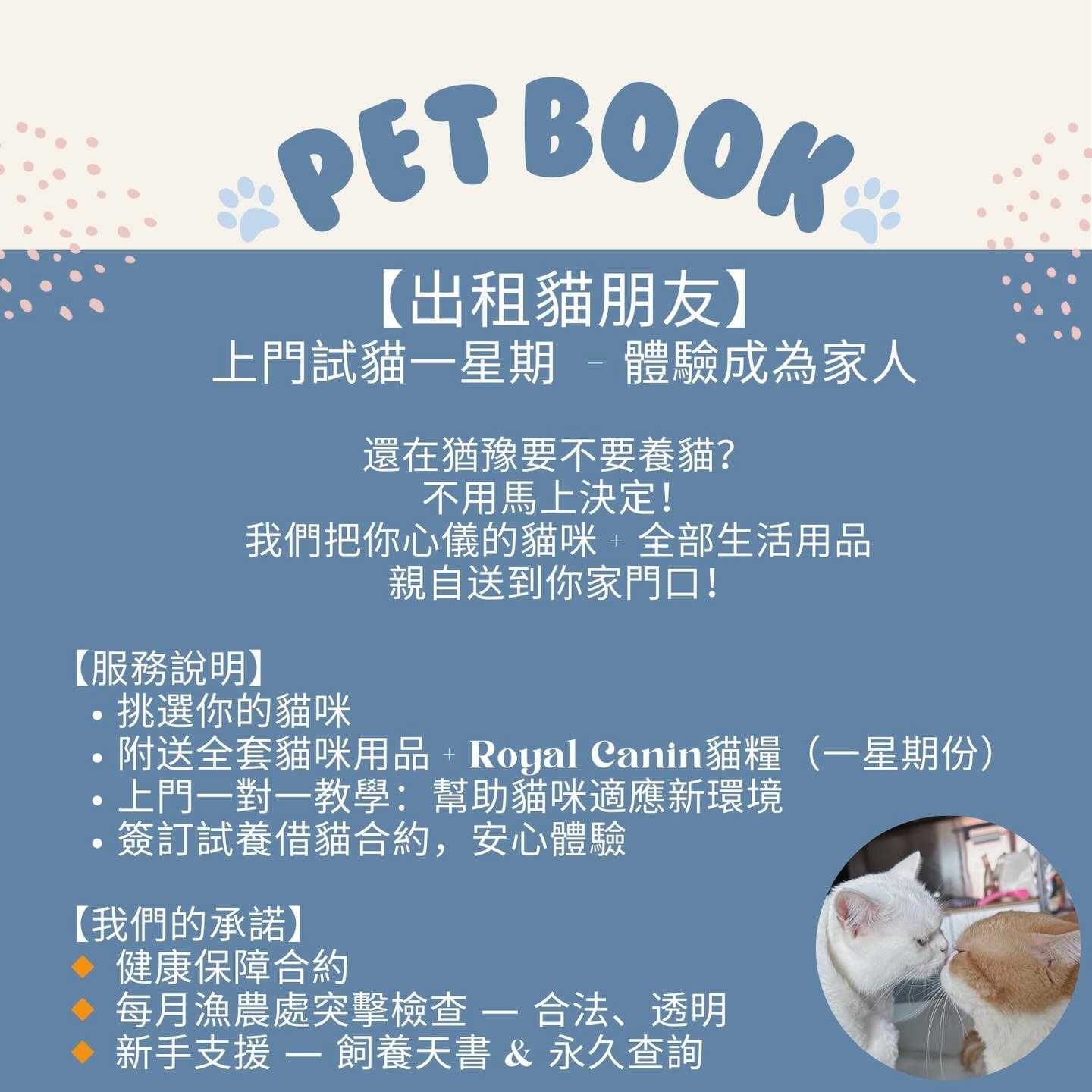 「仲猶豫養唔養貓?Petbook 推出超暖心一星期上門試貓・體驗成為家人」計劃~我哋將合你眼緣嘅貓BB + 全套入屋套裝,直接送到你屋企!一對一上門教你照顧、餵食、幫貓咪適應新環境~」