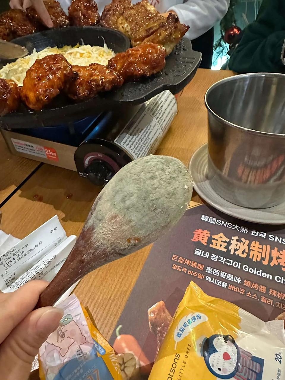 有網民在Facebook「屯門友」發文,控訴屯門商場某間韓式炸雞店,用膳時驚見發霉了的木匙:「昨晚在屯門時代廣場的XXXXX(餐廳名)吃晚飯,叫咗個UFO芝士火鍋。」