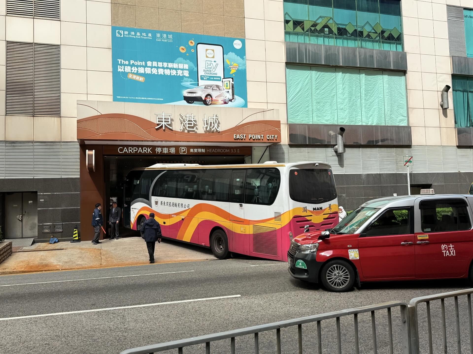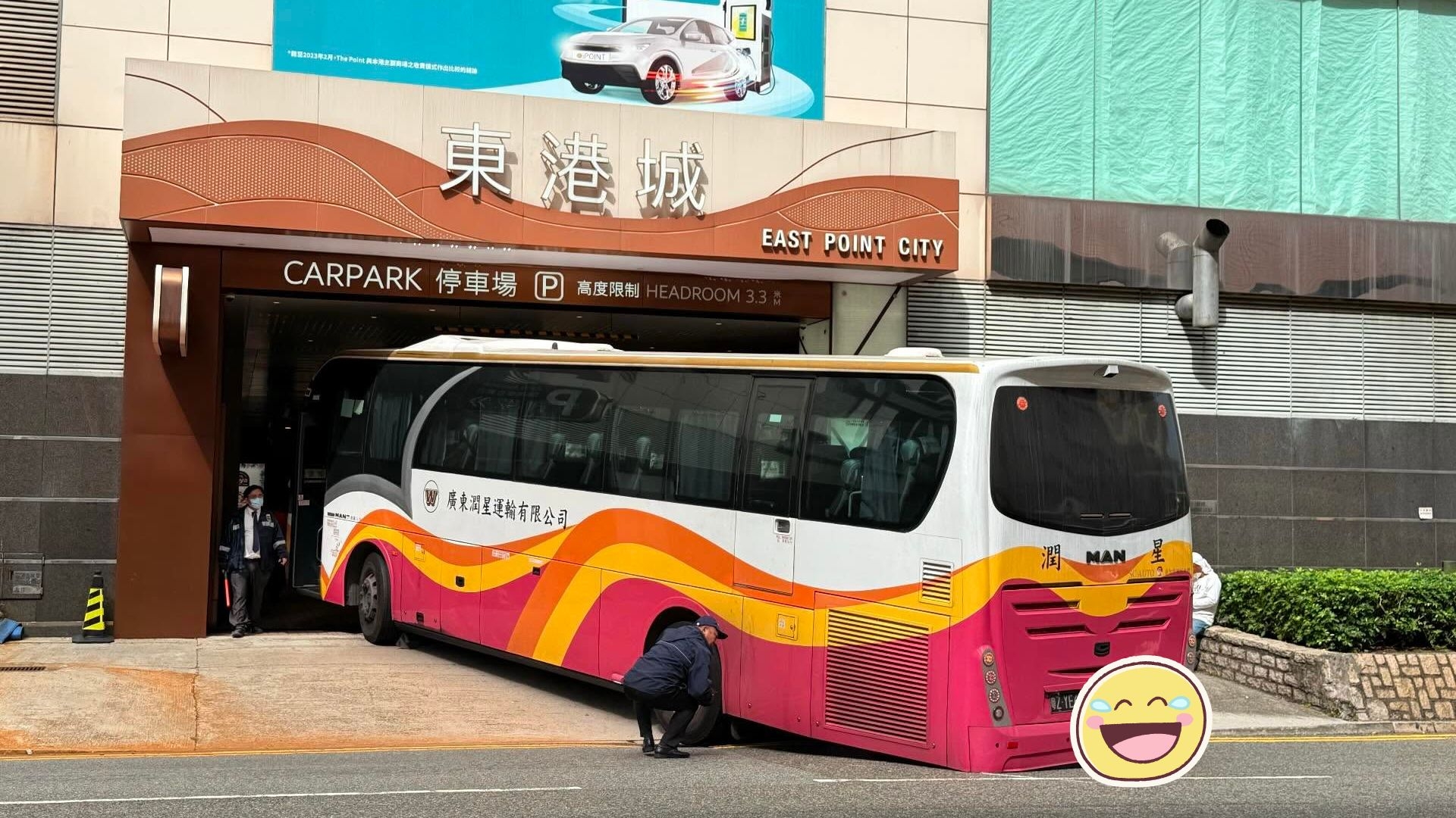 有網民_coooey1222上載了幾日前的街上奇景,一輪旅遊巴駛進入了將軍澳東港城商場的停車場泊車,豈料車場的高度限制,與旅遊巴完美交接,互相卡死,進退不得!