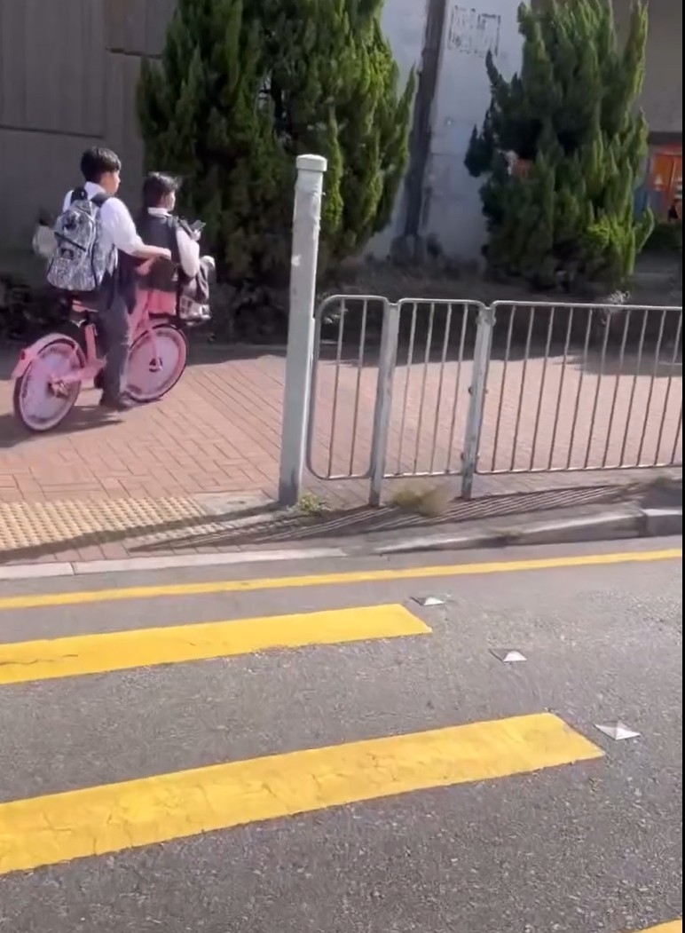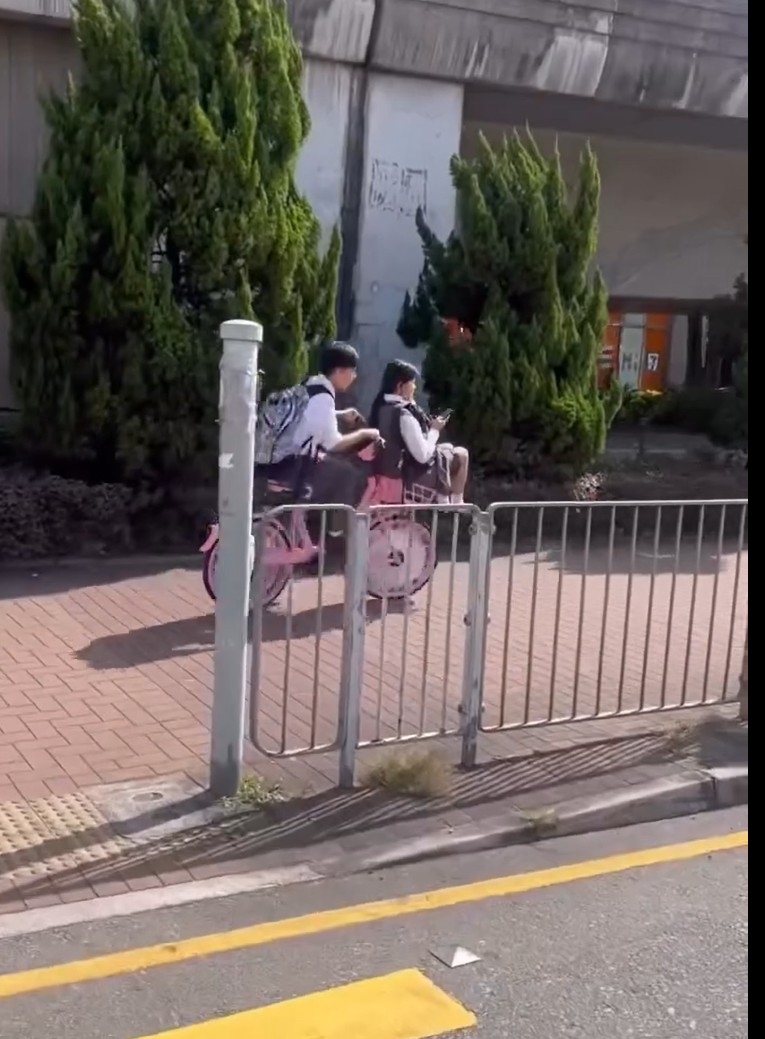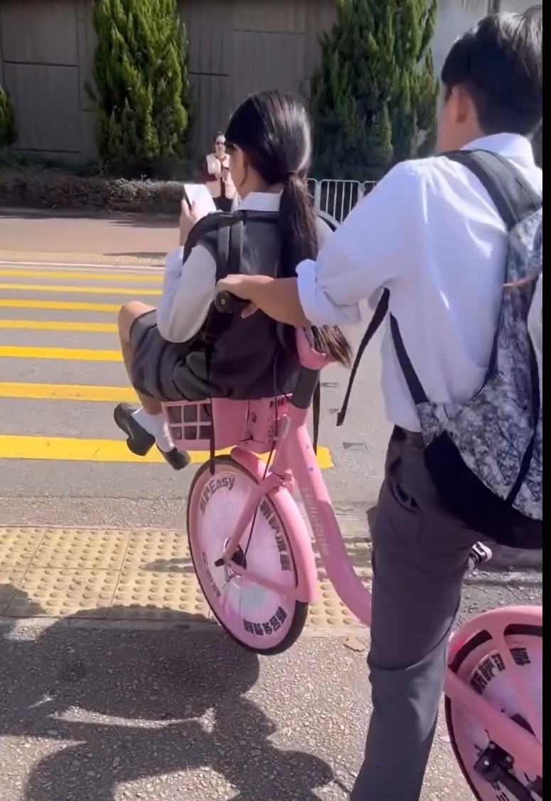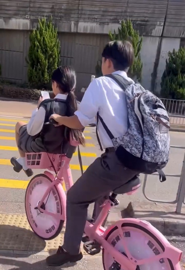 在facebook專頁「屯門友」轉載的片段,就是有一對學生情侶,坐着襯晒色的粉紅單車,穿着校服遊走馬路;女方更大膽地坐在單車前方的車籃內,加插配文:「新單車車籃重力測試?🤔」well,青春,總是美好。