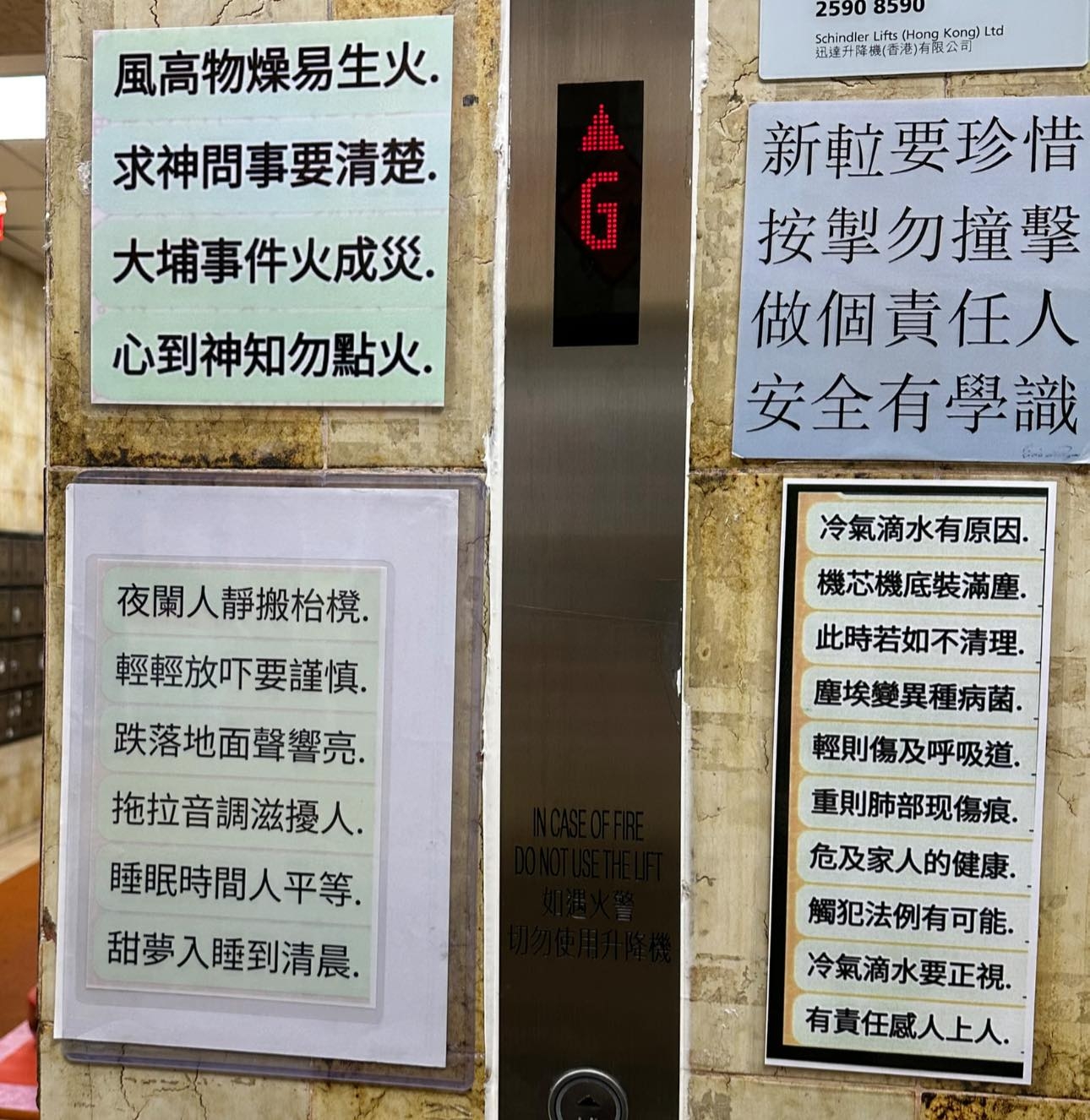 映入眼簾的,是一段又一段的詩句,無論五言詩或七言詩都有,遍佈在大廈電梯顯示版旁,滿滿大廈提示字句之餘,非常發人深省,果然好文采,小編甘拜下風。