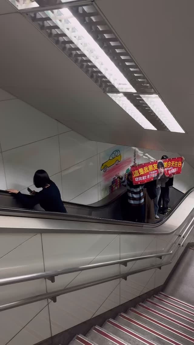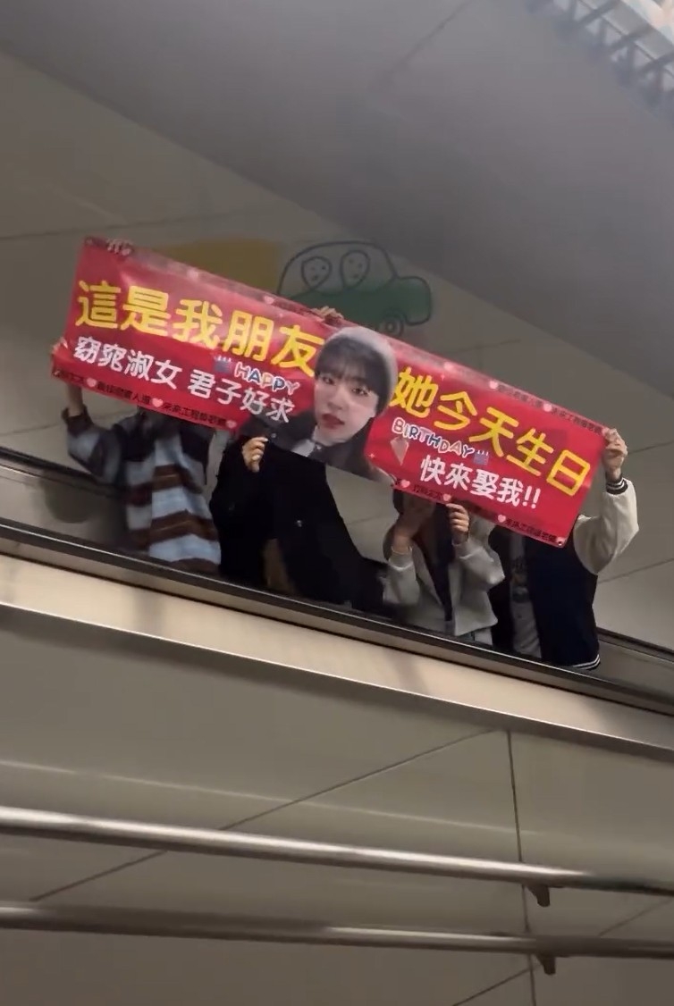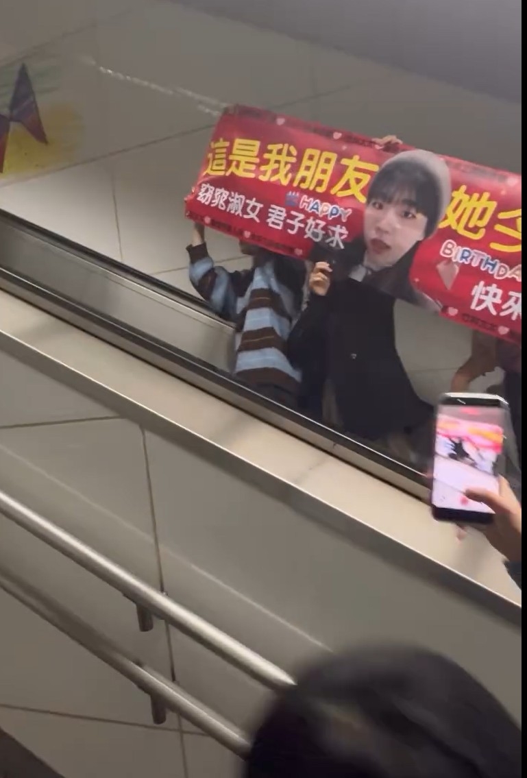 這條開心片段所見,壽星女正是片中正在乘坐電梯的女孩,好老尷地向途人致歉。原來後方一群老Best死士,為壽星女拉起生日Banner,大大隻字標明「這是我朋友,她今天生日。」更有字句浩浩蕩蕩為她求偶,「快來娶我」!