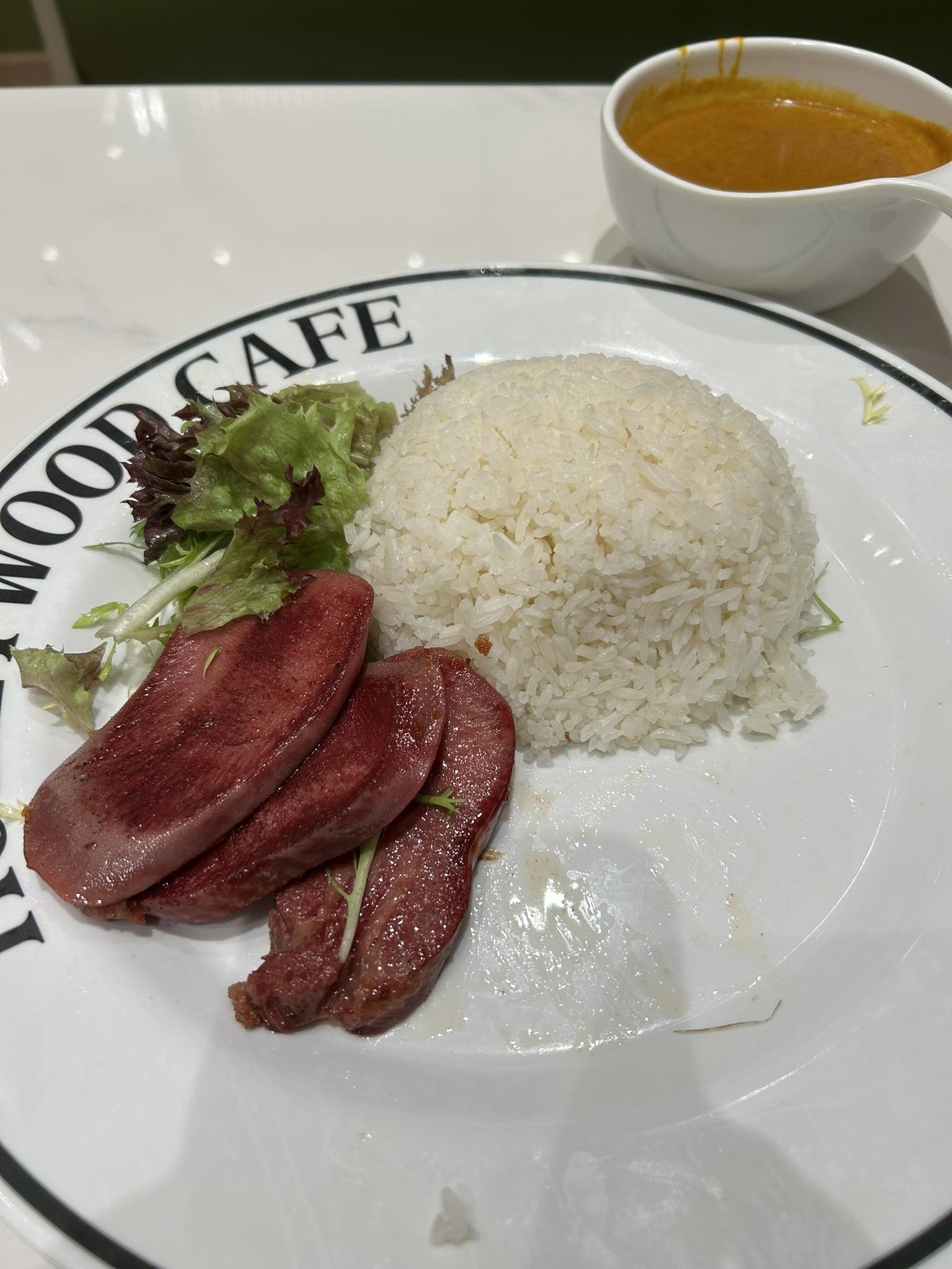 樓主的圖片所示,一碟咖喱金牛舌飯,有三片牛舌,白飯,少少沙律菜,連咖喱汁,完。不過小編覺得,牛舌份量都不是太小片吧。