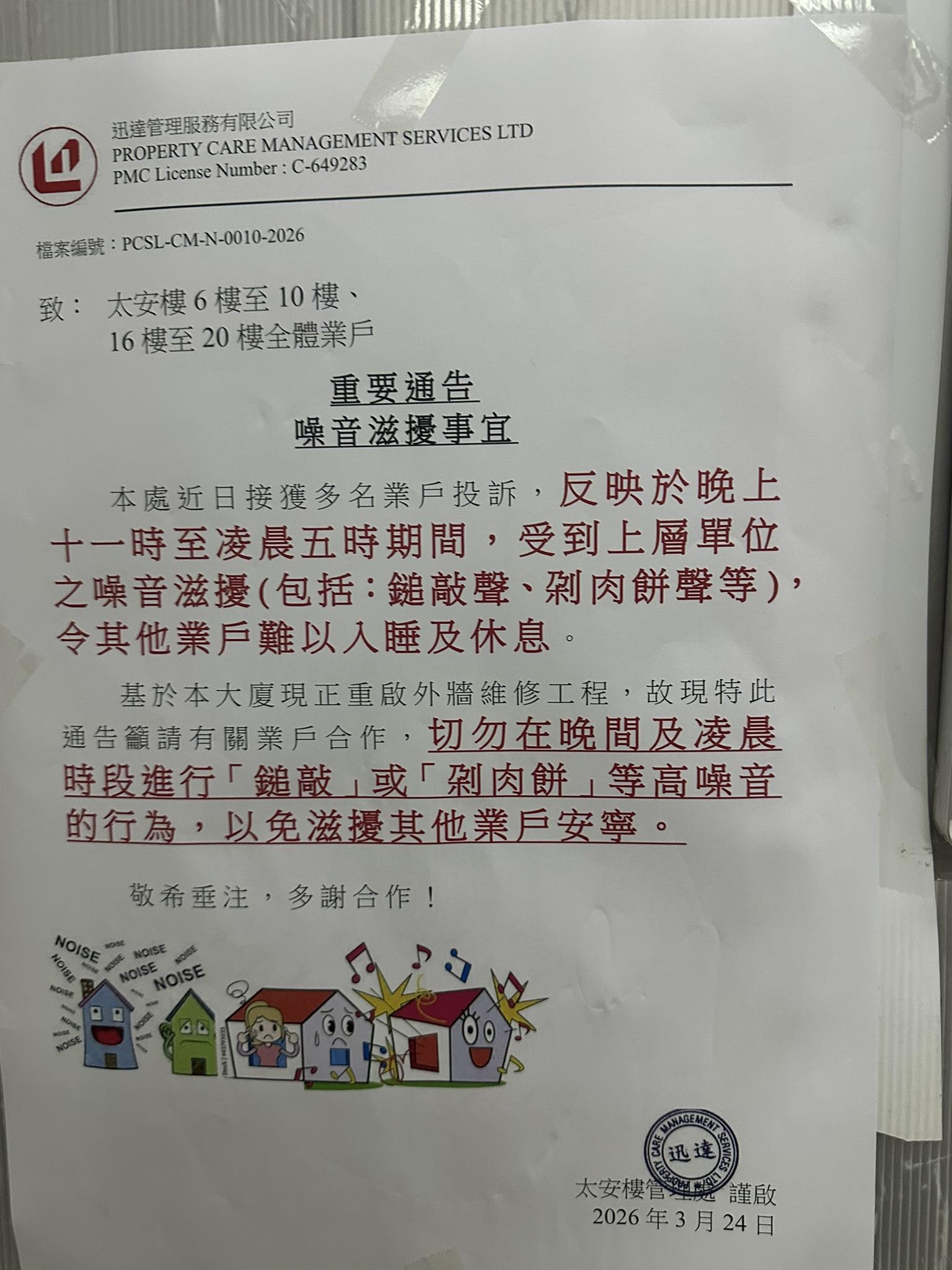 網民在facebook群組「筲箕灣西灣河關注組」發帖文,並上傳了一張屋苑通告,是關於噪音滋擾事宜。通告內文指出,有某個單位在晚上十一時至清晨五時期間,發出「鎚敲聲」、「剁肉餅聲」等噪音,令其他業戶難以入睡及休息。