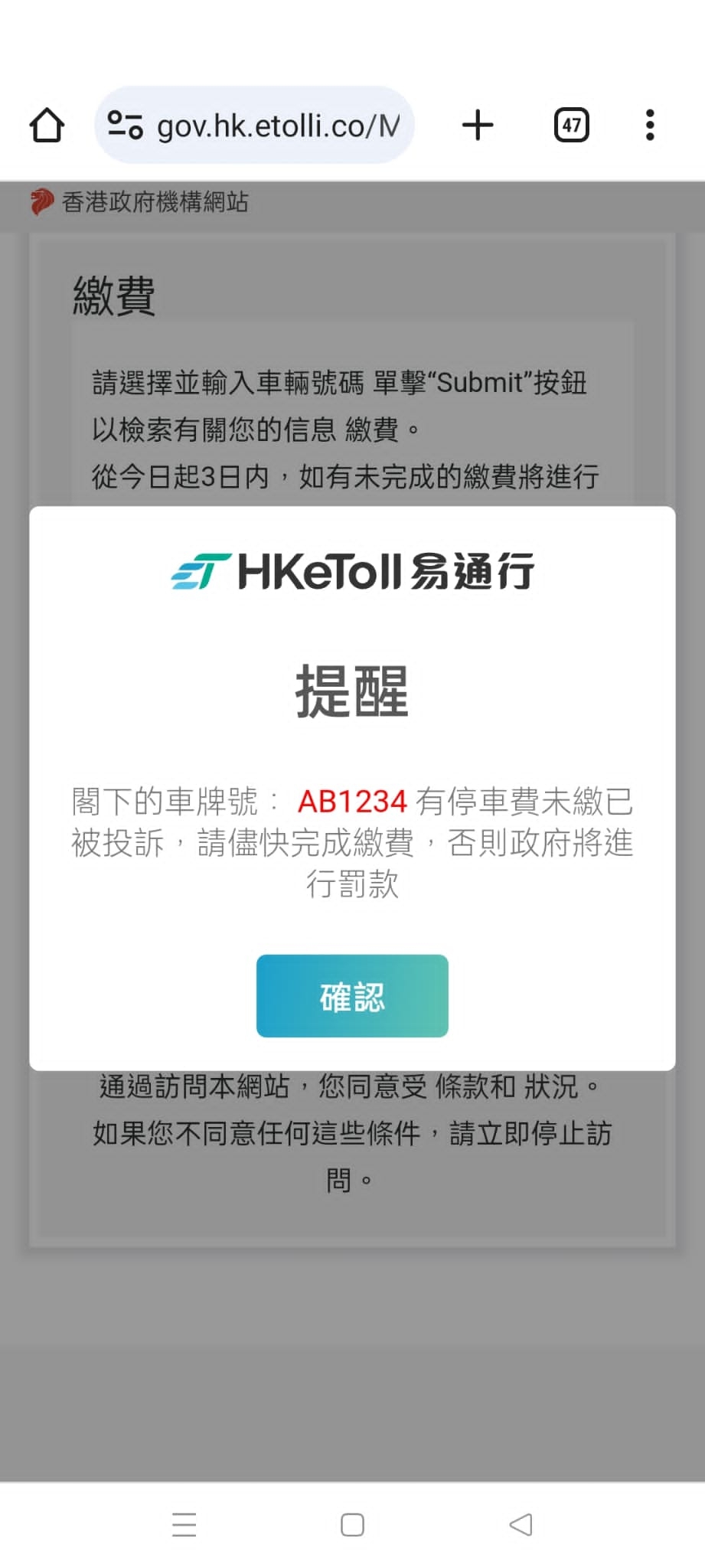 其中一名報料人不虞有詐,按下SMS下面的連結,進入「假可亂真」的假易通行網站,並輸入自己的車牌號碼。其後,該網頁顯示其車輛尚有20元的隧道費並未繳清,要求受害者輸入信用卡資料繳費。