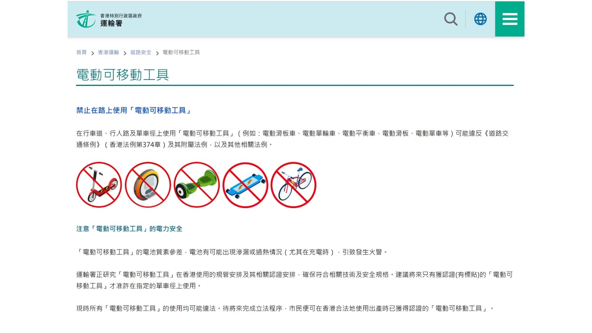 據運輸署發佈,在行車道、行人路及單車徑上使用「電動可移動工具」(例如:電動滑板車、電動單輪車、電動平衡車、電動滑板、電動單車等)可能違反《道路交通條例》(香港法例第374章)及其附屬法例,以及其他相關法例。![]()