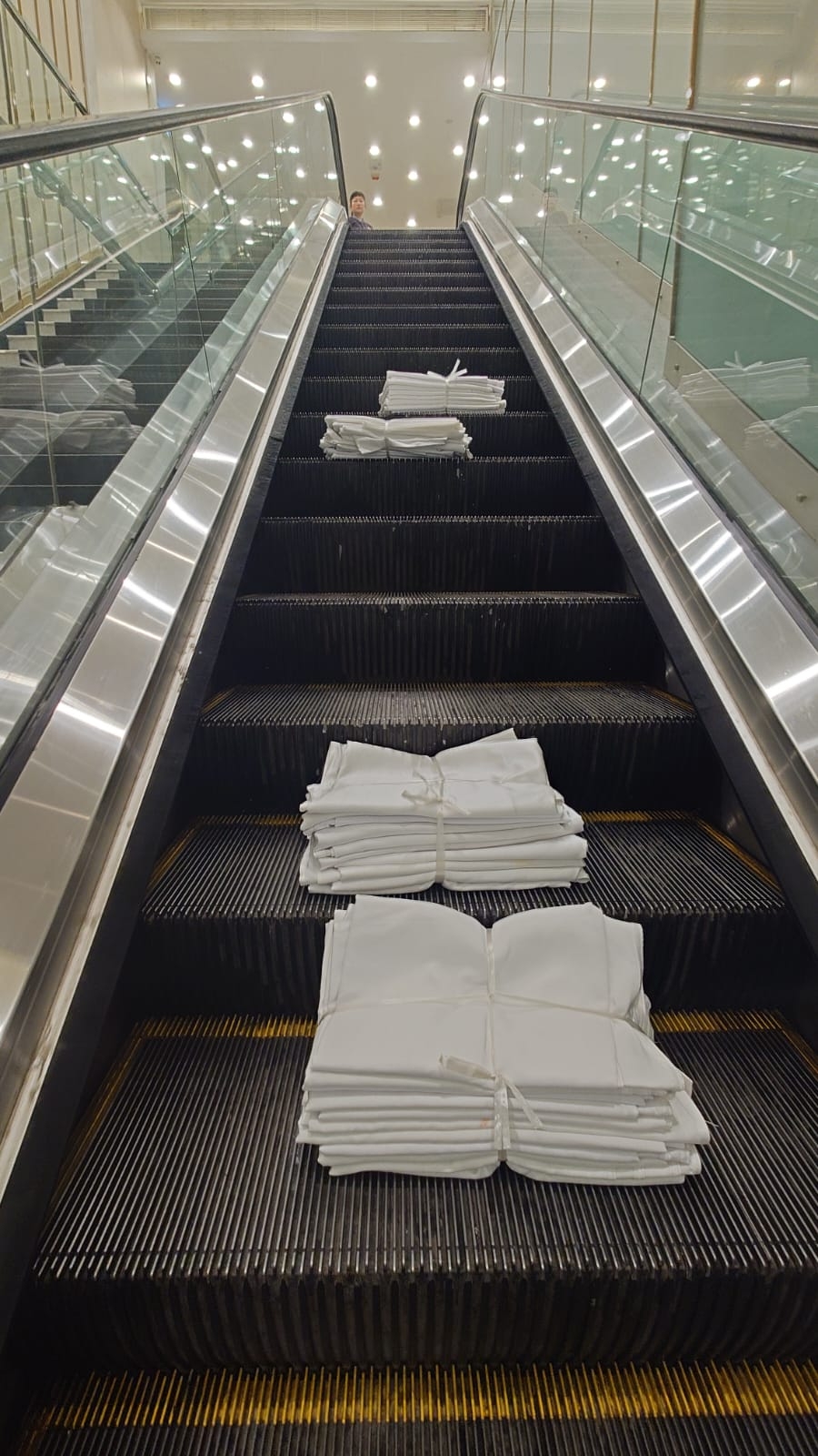 觀眾提供的相片可見,酒樓將已洗淨的枱布,這樣放在扶手電梯上,報料觀眾指:「咁樣放喺扶手電梯,好污糟!」據她透露,涉事的酒樓是位於龍豐花園平台的「百好名宴」。![]()