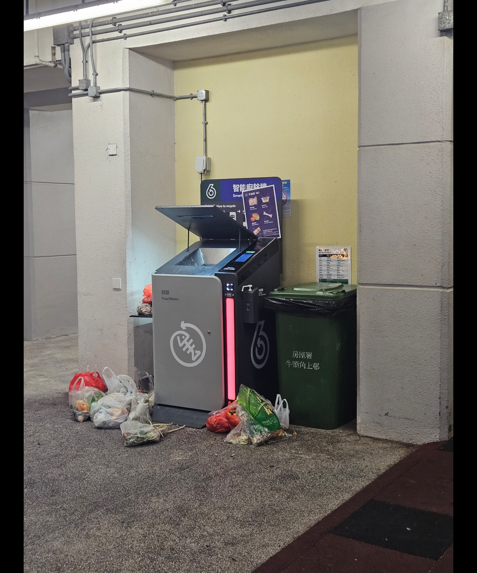 觀眾鄧先生說,昨日凌晨一時許經過牛頭角上邨常康樓地下,看到相片中這樣的情況:廚餘回收機損壞,蓋門打開,未能回收廚放滿周邊。