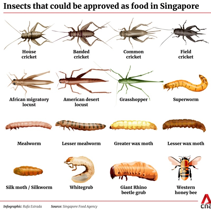 據CNA報導,在7月6日時星國食品局已官宣16種可食用昆蟲,並同意讓這些昆蟲流通到市場上,並指出「隨著公告已發布,食品局會允許這些經過認證的昆蟲和昆蟲加工品進口」。